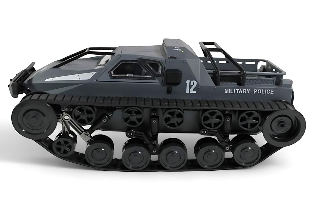 Высокоскоростная модель Military Police на гусеничном ходу способна покорять препятствия как настоящий вездеход. Угол подъема составляет 30 градусов. Торсионная подвеска обеспечивает превосходные ходовые качества. Механизм крепления переднего колеса служит для натяжения гусениц, в результате чего вездеход способен уверенно передвигаться по любой поверхности. Military Police не страшны небольшие ямы (даже до 10 см), он без проблем проезжает их, не проваливаясь.