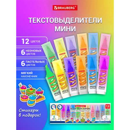 Набор текстовыделителей мини с принтами BRAUBERG — идеальное решение для всех, кто ценит качественную канцелярию и стильные офисные принадлежности. Эти маленькие маркеры выделители предназначены для работы с текстом и таблицами на любой бумаге, включая факс-бумагу, а также нейрографики. Набор включает 12 цветов: 6 неоновых и 6 пастельных, что делает его универсальным для различных задач. Скошенный наконечник текстовыделителей обеспечивает толщину линии от 1 до 5 мм, позволяя выделить даже мелкий шрифт. Эти фломастеры для рисования и выделения текста обладают водной основой чернил, что предотвращает их высыхание без колпачка до 8 часов. Чернила быстро впитываются, предотвращая размазывание, а светоустойчивость позволяет сохранять яркость на солнце. Маркеры BRAUBERG для школы и офиса — это экономный расход и длина линии до 300 метров. Цвет корпуса и колпачка фломастеров соответствует цвету чернил. Эти милые маркеры станут отличным подарком ребенку, набором для творчества для девочек и мальчиков, любящих аниме и скетчинг, а яркие неоновые и нежные пастельные цвета неизменно будут радовать глаз. Набор текстовыделителей BRAUBERG станет незаменимым помощником в работе и учебе!