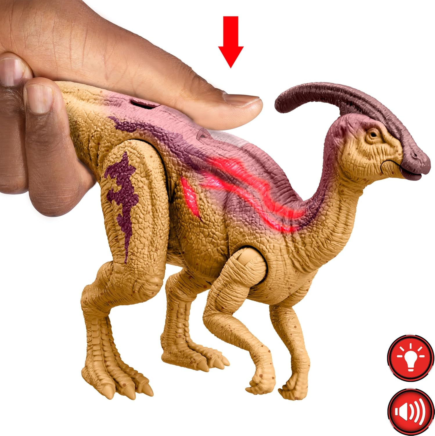 Фигурка Jurassic World HTK76 изображает паразауролофа — динозавра, который светился в темноте благодаря генам морских форм жизни. Игрушка снабжена кнопкой, активирующей светодиодную подсветку и грозный рев для максимальной реалистичности. Подвижные суставы лап и челюсти позволяют придавать фигурке разные положения. Игрушка поставляется с кодом для активации в приложении Jurassic World Play, которое предлагает множество интересных задач по спасению и изучению древних животных.