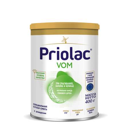 Priolac VOM – специализированная сухая молочная смесь для детей с рождения при срыгиваниях, запорах и коликах. Благодаря натуральной камеди рожкового дерева Priolac VOM обладает рядом ключевых преимуществ: