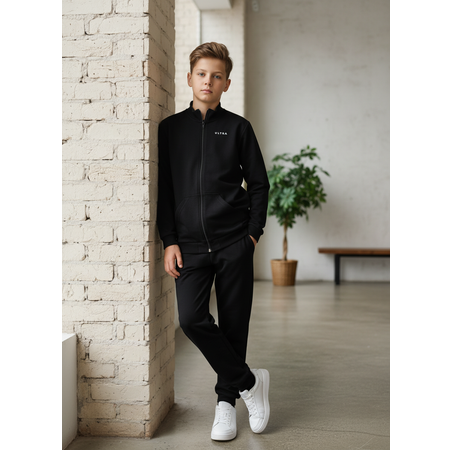 Олимпийка для мальчика и брюки для мальчика. На олимпийке карман-кенгуру, мягкий воротник, манжеты и низ из эластичного трикотажа. Застёгивается на молнию, на бегунке пуллер. Спереди принт. Брюки на широкой резинке в поясе. На штанинах манжеты. Глубокие карманы спереди. Выпускается костюм в черном цвете. Черный спортивный костюм.