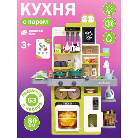 Игрушечная выполнена в оригинальном дизайне и стилизована под настоящую кухню. Игровой модуль состоит из плиты с 2 конфорками, а из одной идет безопасный пар, свет и звуки приготовления, крана для воды и набора из 63 предметов, среди которых: столовые приборы, игрушечные продукты, посуда.