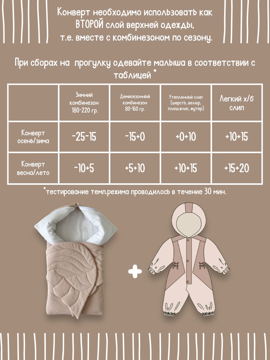 Всегда используйте конверт как второй слой верхней одежды в паре с комбинезоном по погоде. Чтобы правильно одеть малыша на прогулку, пользуйтесь нашей таблицей на фото.