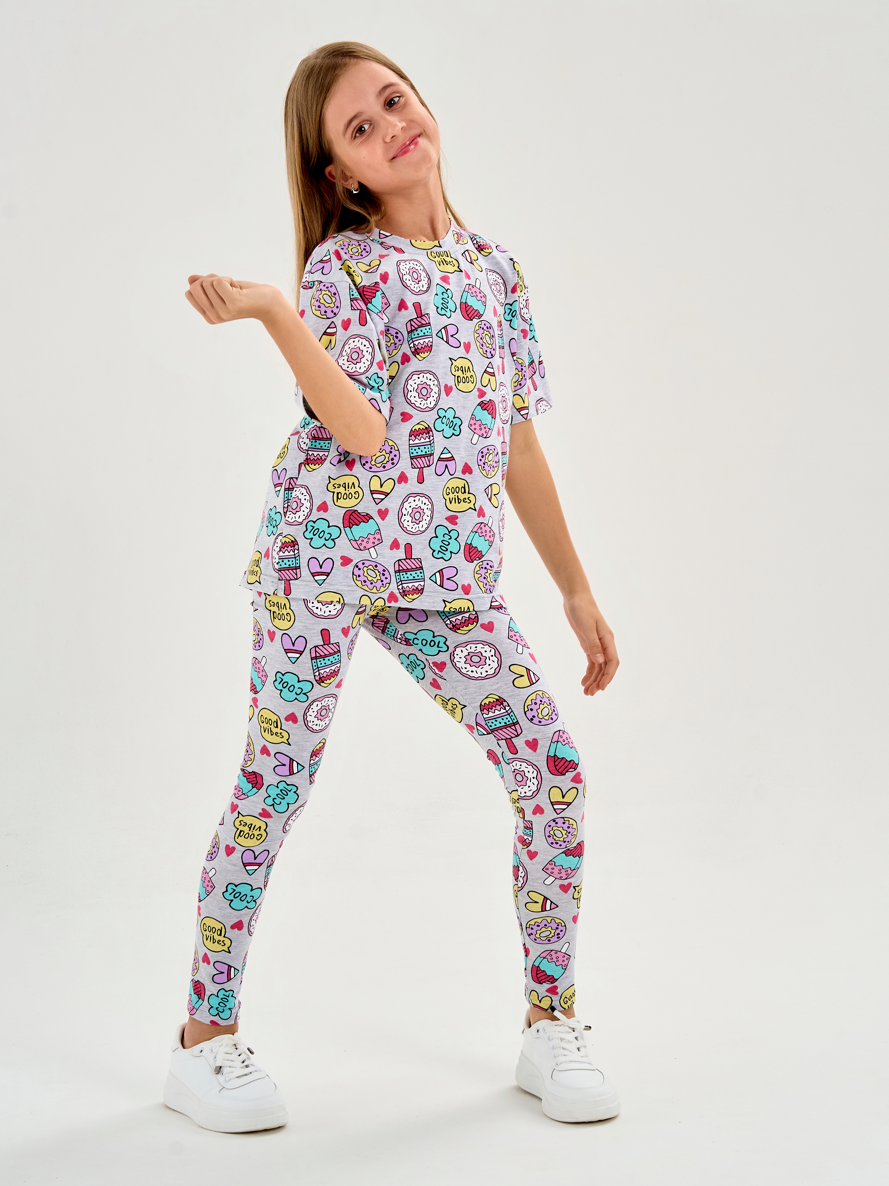 Костюм для девочки состоит из футболки и легинсов, выполнен из 100% премиального хлопка. Комплект для девочки подростка, декорирован ярким принтом. Домашний костюм детский подходит для повседневной и домашней носки. Футболка прямого кроя, с округлым вырезом горловины. Тайтсы облегающие, на широкой вшивной эластичной резинке. Комплект с лосинами и футболкой приятный к телу, не стесняет движений. Яркие трендовые цвета и ассортимент размерного ряда сделают эту базовую универсальную модель незаменимой в гардеробе ребенка. Наряд летний со штанами для девочки - это комплект для активных девочек, вариант в стиле спорт-шик. Идеальный выбор для поездок на дачу или домашнего отдыха.
