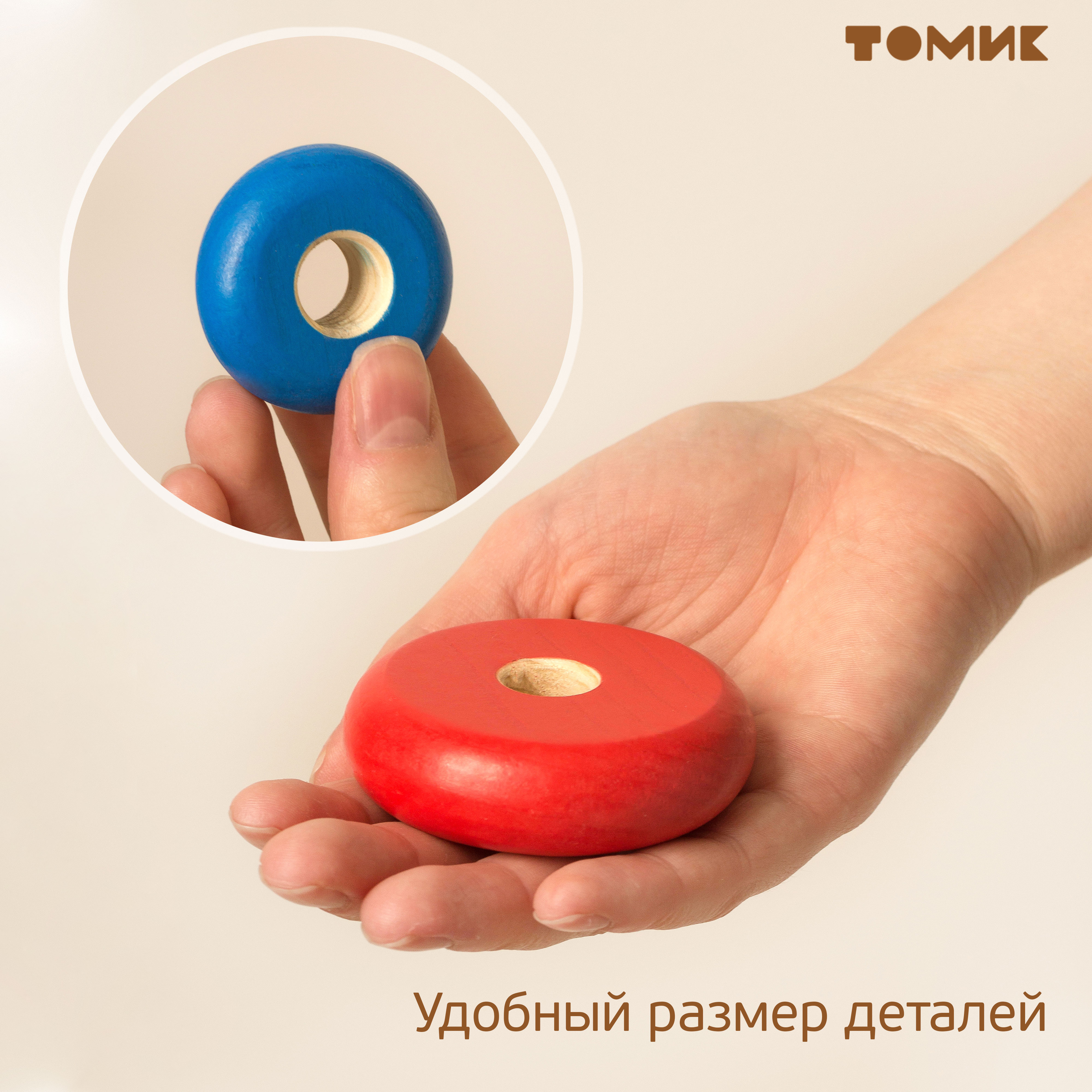 Пирамидка для малышей — одна из первых развивающих игрушек малыша, которая состоит из основы-стержня, круглых колец и наконечник - шарик . Каждое кольцо разного цвета и диаметра. Собирая колечки, ребёнок освоит основные цвета радуги и получит базовые навыки счёта. Пирамида детская разовьет у крохи мелкую моторику рук, координацию движений, воображение, логическое и образное мышление, навыки конструирования. Он научится различать предметы по величине, сравнивать их и надевать колечки по порядку. Также во время игры происходит изучение цветов , геометрических фигур, учится понимать размеры фигурок и т.д. Юный конструктор познакомится с такими понятиями, как «больше», «меньше», «круг», «конус», «плоский», «объёмный». Игра с пирамидкой способствует развитию у ребенка внимания, усидчивости, пространственного мышления. Для детей младшего возраста данный набор будет незаменимым помощником, т.к. на этом этапе формируется понятие о цветах и формах. Детская развивайка - логическая игра для детей с самого раннего детства. Ребенок будет в восторге от игры в пирамидку ! Задачей фабрики Томик является здоровье и безопасность вашего ребенка, поэтому при производстве игрушек и товаров для самых маленьких мы используем экологичные, абсолютно безвредные для детей материалы, элементы пирамидки выполнены из дерева с нанесением краски на водной основе насыщенных цветов. Тактильный контакт с этим материалом оказывает положительное воздействие на сенсорное развитие ребенка, приятные на ощупь . Яркие и насыщенные цвета сразу привлекут вашего ребенка для игры в пирамидку. Игрушечные пирамидки предназначены для детей от 1 (одного) года, для самостоятельной игры от 3 х (трех) лет.