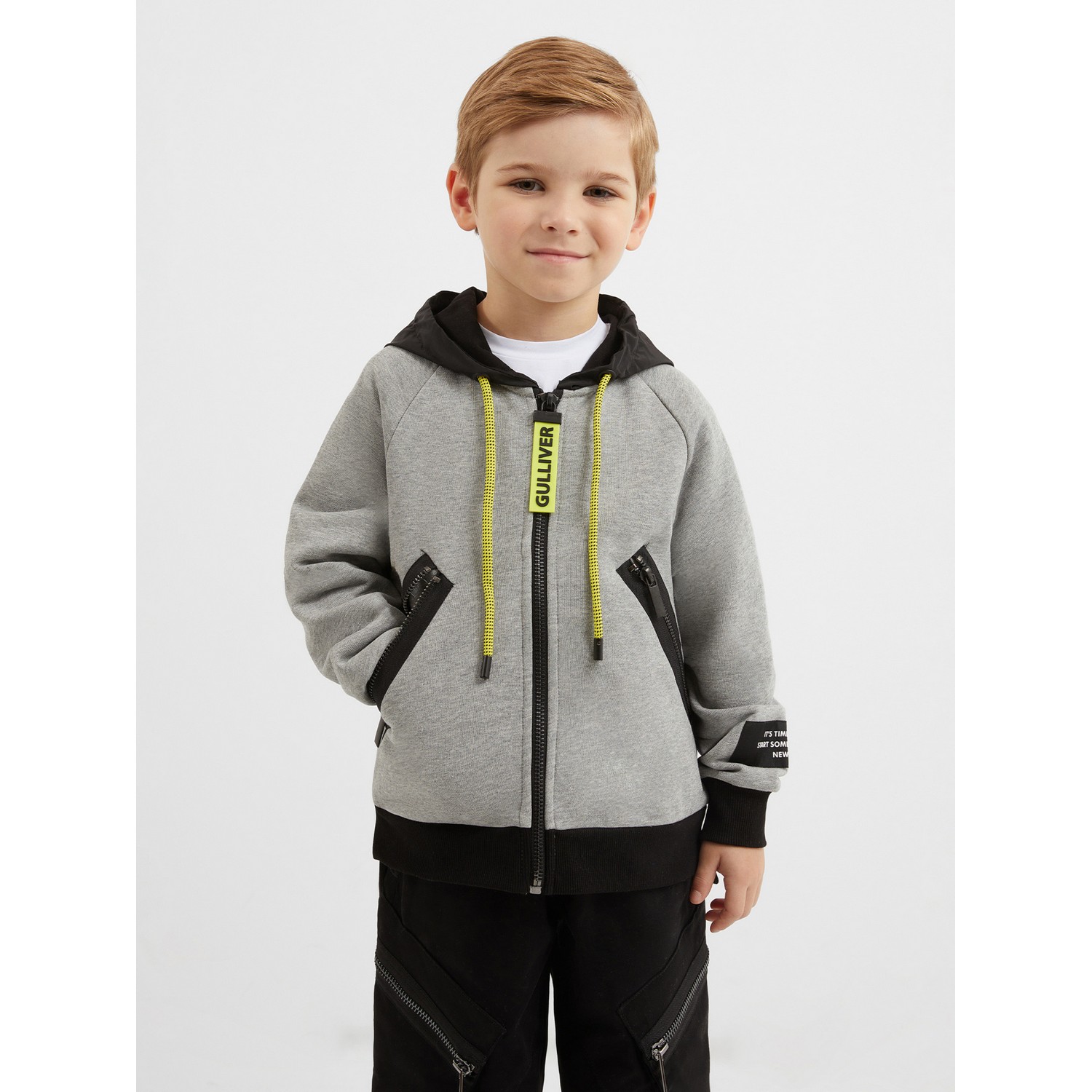 Толстовка для мальчика. Серая распашная толстовка выполнена из мягкого меланжевого трикотажа с ворсистой тёплой изнанкой. Материал пластичен, приятен на ощупь, обладает прекрасной формоустойчивостью, прост в уходе и эксплуатации. Толстовка имеет карманы на литых молниях, капюшон с кордами, манжеты и резинку по низу. На рукаве расположена нашивка с шрифтовыми элементами, на спинке — шрифтовой принт. Толстовка застёгивается на молнию с ярким брендированным пуллером. Модель составит завершённый расслабленный комплект с серыми брюками 22406BMC1607 и не только.
