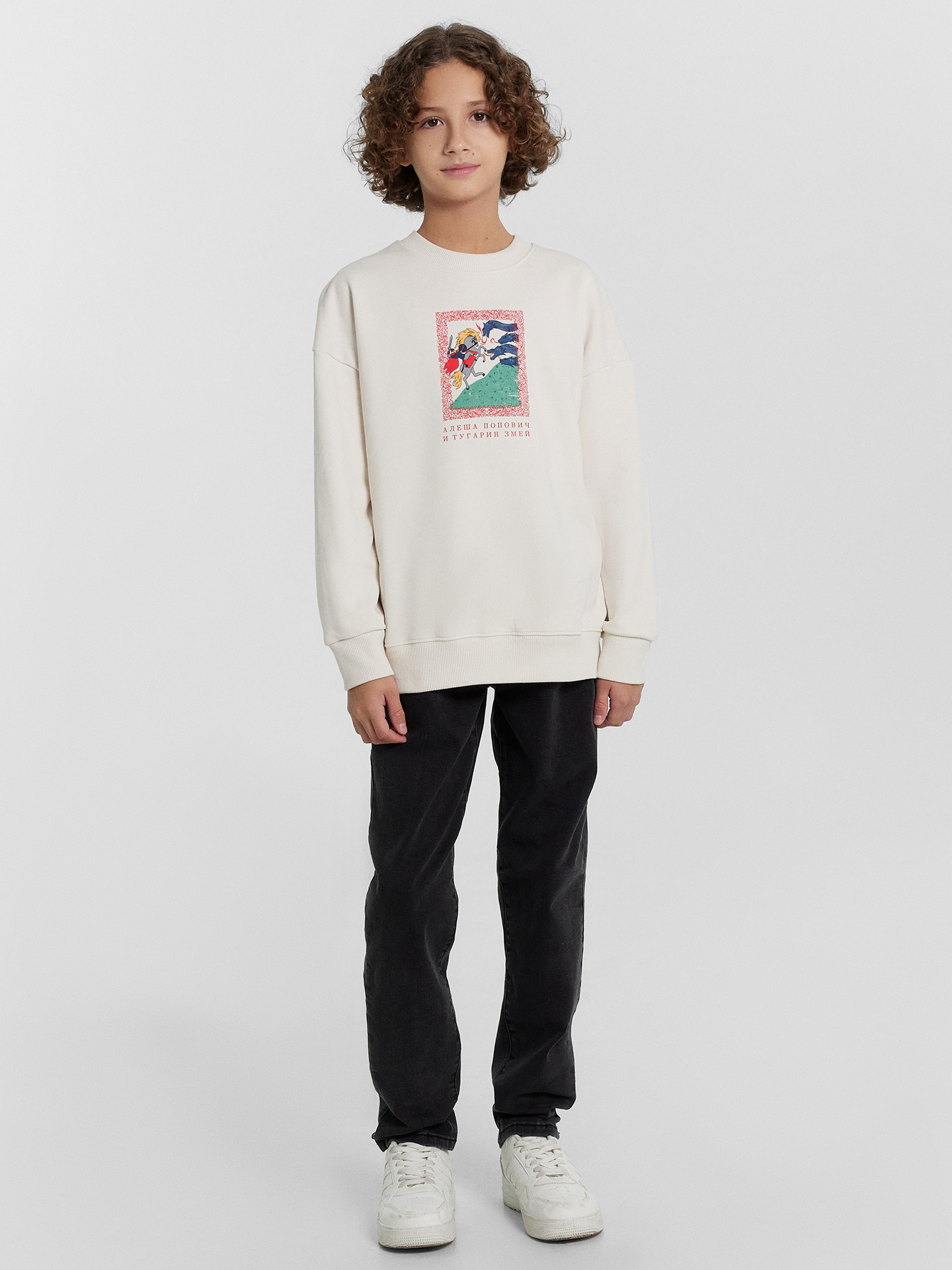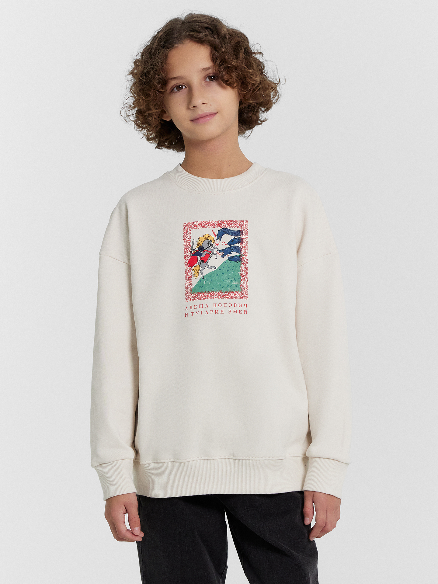 Стильный свитшот для мальчика выполнен из высококачественного хлопка без начёса с печатью в виде сцены из сказки "Алёша Попович и Тугарин Змей». Стильная кофта свободного кроя без начеса, с круглой горловиной и принтом. Комфортная и мягкая кофточка станет основой гардероба вашего ребенка. Комфорт и стиль объединяются в свитшоте оверсайз с ярким принтом для юного модника. Эта одежда подойдет для школы и повседневной носки, создавая неповторимый стильный образ. Толстовка сделана из мягкого материала, который обеспечит тепло и комфорт в прохладные дни. Она легко сочетается с другой школьной одеждой и идеально впишется в гардероб как дополнительный элемент школьной формы. Худи для мальчика оверсайз станет прекрасным выбором не только для мальчиков, но и для девочек. Универсальный фасон позволяет свободно двигаться, положительно влияя на уровень комфорта. Джемпер для девочки подходит как для активного отдыха, так и тихих занятий в классе. Модный дизайн этой толстовки делает её привлекательной для подростков. Среди других предметов одежды эта кофта выделяется своим практичным стилем. Она прекрасно сочетается с джинсами или брюками, оформляет завершенный школьный образ и прекрасно подходит на каждый день.