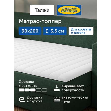 Сколько см высота матраса Здравствуйте. Матрас IKEA «Талжи» 90×200 имеет высоту около 3,5 см — это тонкий матрас‑топпер, предназначенный для использования поверх основного матраса или дивана. Он не является полноценным высоким матрасом, а служит для выравнивания и повышения комфорта спального места.