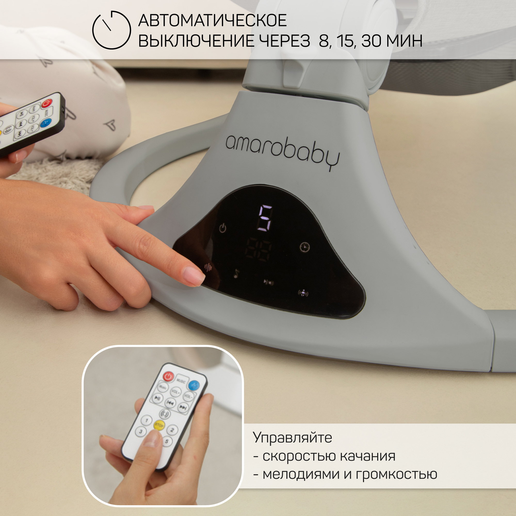 Электронные качели для малышей Amarobaby Funny swing прекрасное решение для заботливых родителей. Благодаря большому количеству разнообразных функций, вы всегда сможете подобрать комфортное положение и развлечение для вашего малыша. 12 встроенных мелодий, создадут комфортную и не повторимую атмосферу, с помощью функции Bluetooth вы сможете поставить любую понравившуюся мелодию прямо с телефона. Так же вы можете воспользоваться функцией usb, заранее записав на носитель любимые сказки и мелодии в формате mp3. Комфортные ремни безопасности с гибкой регулировкой, надежно удерживают ребенка в качелях, обеспечивая ему повышенную безопасность. С помощью пульта ДУ, который идет в комплекте, вы легко сможете управлять функциями электрокачели на расстоянии, продолжая заниматься домашними делами. 5 скоростей укачивания позволяет настроить интенсивность качания в соответствии с вашими предпочтениями. Электрокачели для новорожденных оснащены очаровательными мягкими игрушками с погремушками, это стимулирует развитие мелкой моторики рук и обеспечивает дополнительное развлечение для малыша. Так же, модель оснащена не только возможностью питания от сети при помощи встроенного кабеля, но и от элементов питания 4 шт. АА (батареек/аккумуляторов, в комплект не входят). Вы можете использовать ее не только дома, но и в поездках или на даче. Электрокачели Amarobaby имеют функцию автоматического отключения по таймеру через 8, 15 или 30 мин. Модель обладает лаконичным, стильным дизайном, который впишется в любой интерьер. Возможность использовать качели без матрасика в жаркую погоду позволит ребенку ощутить дополнительный комфорт во время сна, сетчатая спинка предотвратит перегревание. Электронные качели AmaroBaby Funny swing - это надежное и удобное решение для мам и их малышей. Они обеспечивают безопасность, развлечение и комфорт, позволяя вам наслаждаться временем для себя, пока она заботиться о вашем малыше. Идеальный подарок для вас и ваших друзей!