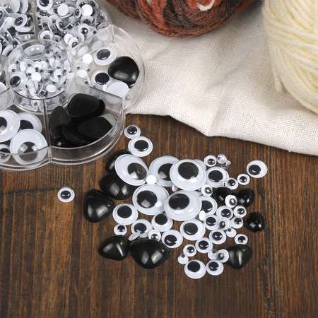 Комплект клеевых глаз и носиков. Глаза бегающие круглые, диаметр от 5 мм до 18 мм, носы - от 10 мм до 20 мм. Для фиксации требуется клей (в комлект не входит!)Упаковка: 320 шт.