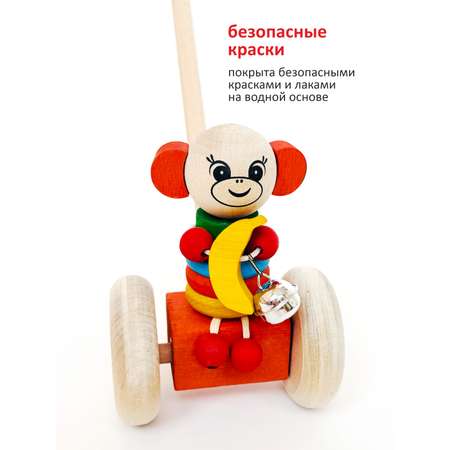 Окрашены безопасными водными пропитками и лаками, сертифицированными для малышей. Каталку на палке можно мыть или протирать влажной тканью. Сделана В России. Общая длина 50 см.