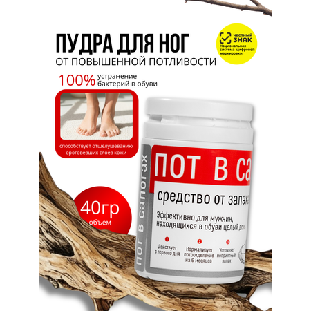 Пот в сапогах - средство дезодорант от пота и запаха ног. Объем банки 40гр. Порошковое средство содержит триклозан - антибактериальный и противогрибковый агент широкого спектра. Действует на многих представителей грамположительной и грамотрицательной флоры, а также на грибковые микроорганизмы. Антиперспирант против запаха и пота решает проблему неприятных запахов повседневной и спортивной обуви раз и навсегда. Тальк для ног обладает антибактериальным и дезинфицирующим действием. Нейтрализатор запаха - это не обычный дезодорант для обуви, а эффективное порошкообразное средство, которое устраняет источник неприятного запаха и бактерий, а также продлевает срок службы обуви. При регулярном использовании этого дезодоранта не только уходит неприятный запах, но и предотвращает чрезмерное потоотделение. Порошковый дезодорант - это средство нового поколения, в составе которого только натуральные ингредиенты. Они не вызывают раздражения, аллергии и его можно использовать как мужчинам и женщинам, школьникам и подросткам. Для более длительного эффекта рекомендуем пользоваться совместно с нашим антибактериальным СПРЕЕМ для ног. Применение порошка: засыпать содержимое пакетика внутрь ботинка (на каждый ботинок - один пакетик пудры). После применения можно сразу обуваться. Действует не менее 8 часов. Подходит для обработки: спортивной обуви, кроссовок, роликов и коньков, горнолыжных ботинок, повседневной обуви.