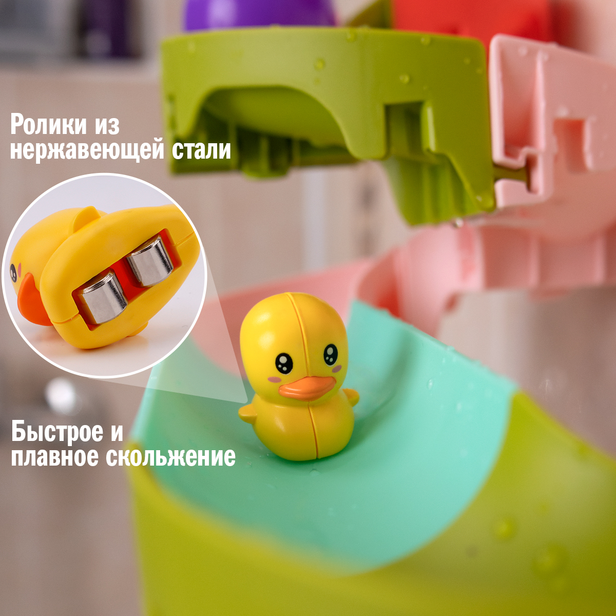 Водный серпантин, это увлекательная игра для детей от трёх лет и старше. Оригинальный конструктор легко собирается и, благодаря вакуумным присоскам, надёжно крепится к различным гладким поверхностям: керамика, пластик, стекло. Сборная водная дорожка выполнена из качественного материала высокой прочности, устойчивого к растрескиванию, нетоксичного и без запаха. Насыщенные и мягкие цвета, качественная прокраска – несомненные плюсы водной горки.Разнообразные формы для сборки способствуют творческому развитию малыша, используя различные комбинации деталей можно собрать ни один вариант серпантина. Более увлекательной игру делают дополнительные аксессуары, которые входят в комплект. Забавные персонажи: утёнок, мяч-смайлик и капсула добавят сюжет в игру, обогащая воображение ребёнка. А наблюдая за тем, как герои скатываются по извилистой дорожке, тренируется зрительно-моторная координация. Игра с помощью водного гоночного трека станет не только любимой, но еще и чрезвычайно полезной для крохи. Опыты с водой позволяют познакомить малыша с окружающим миром, развить мышление и любознательность. Игрушку можно использовать не только в ванной, но и в других местах, крепя ее к гладкой поверхности, например, к стеклянной двери или холодильнику.Рекомендуем играть с родителями, если ребенку ещё нет 3 лет.Не требует батареек. Комплектация 45 шт деталей: Прямые длинные элементы горки 2шт. Поворотные элементы горки 20шт. Прямой короткий элемент горки 4 шт. Завершающий элемент горки 1шт. Длинные поворотные элемент 1 шт. Уточка на роликах 2шт.Шарики погремушки 2 шт. Шарики 2 шт. Мельница - колесо 1шт. Стаканчик 1шт. Крепкие присоски 8шт. Заводная уточка 1шт.Упаковка - Красивая подарочная коробка.