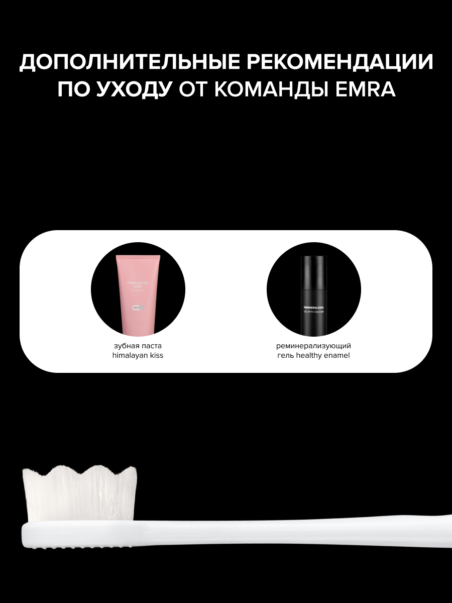 А чтобы укрепить и защитить эмаль, используйте щетку в дуэте с зубной пастой BRILLIANT SMILE, пенкой и ополаскивателем EMRA.