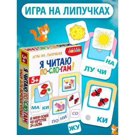 В комплекте: 8 мини-полей с уже приклеенными липучками, 24 карточки со слогами, 24 карточки с предметами, правила