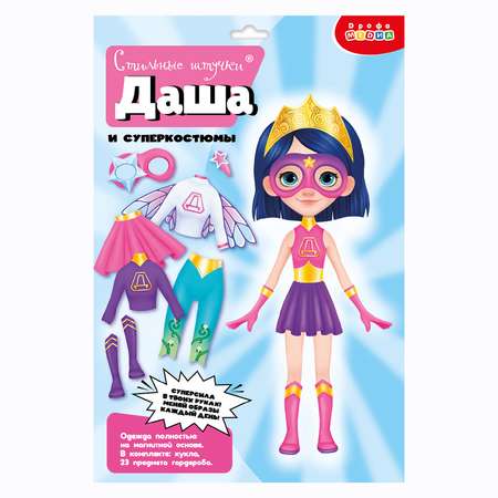 В набор входит магнитная кукла с одеждой. Здесь есть всё для создания супергеройского образа — костюмы, маски и разнообразные аксессуары. Создавай супергеройские образы и меняй их вместе с Дашей! Наряжай свою куклу и придумывай сюжетно-ролевые игры! Вся одежда и аксессуары для куклы с магнитной основой и поэтому они хорошо держатся на куколке, легко снимаются и надеваются.