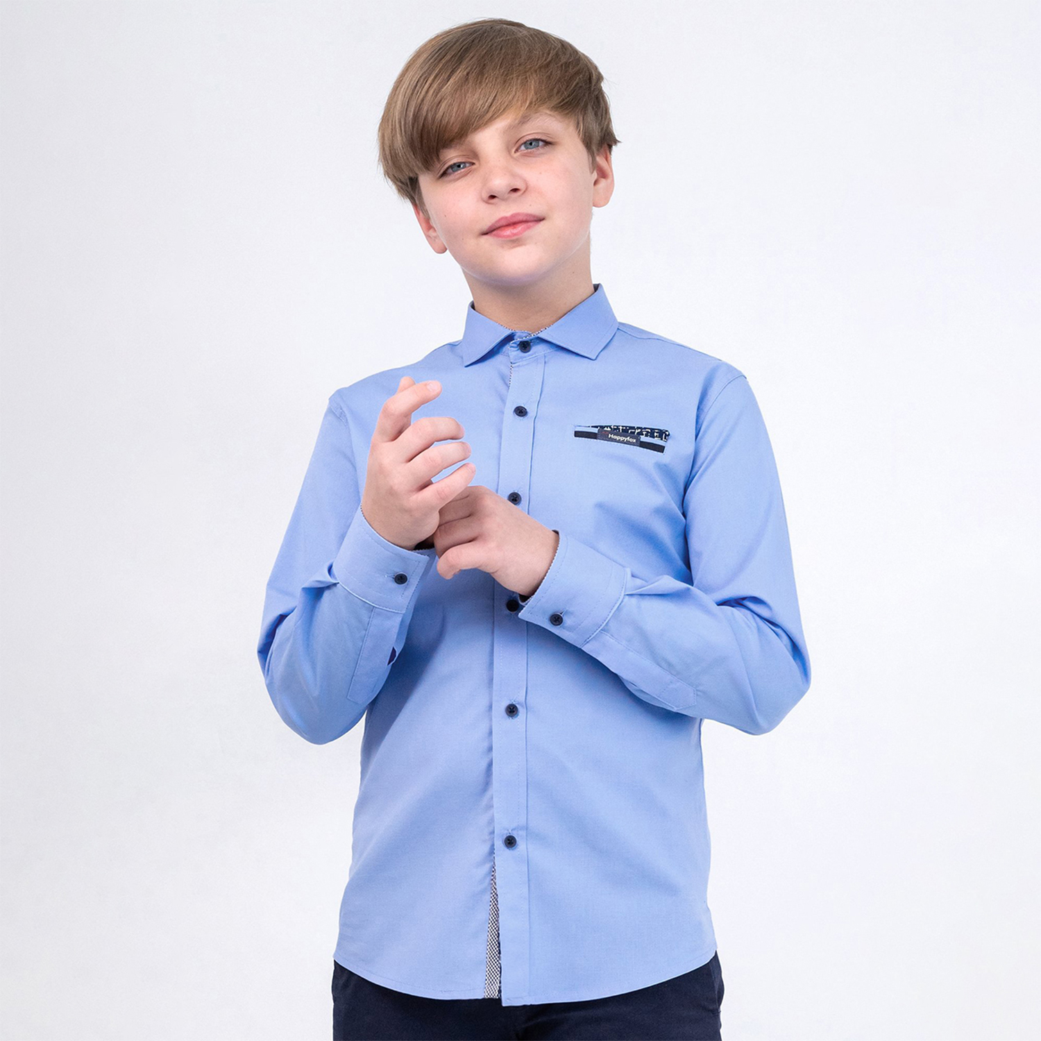 Оставайся стильным в рамках школьного дресс-кода! Детская рубашка для мальчиков и мальчиков-подростков выполнена из мягкого хлопка. Аккуратный отложной воротник, классическая застежка на пуговицы, длинный рукав и имитация платочка на груди делают образ сдержанным и опрятным. Голубая рубашка для детей станет идеальной основой для школьного образа!