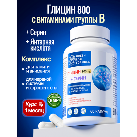 Глицин 800 работает в синергии с серином - аминокислотой нейромедиатором, с янтарной кислотой, витаминами группы В - В1, В6, В9, В12, а также с витамином D3.