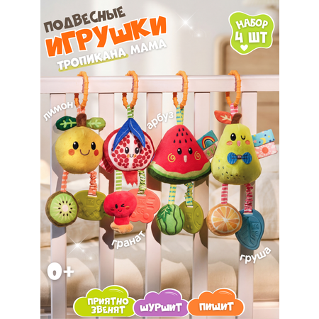 Набор “Тропикана Мама” от Zeimas - это 4 мягкие подвесные игрушки-фрукта: лимон, гранат, арбуз и груша. Каждая игрушка наполнена звуками, текстурами и деталями, которые помогают малышу познавать мир с первых дней.