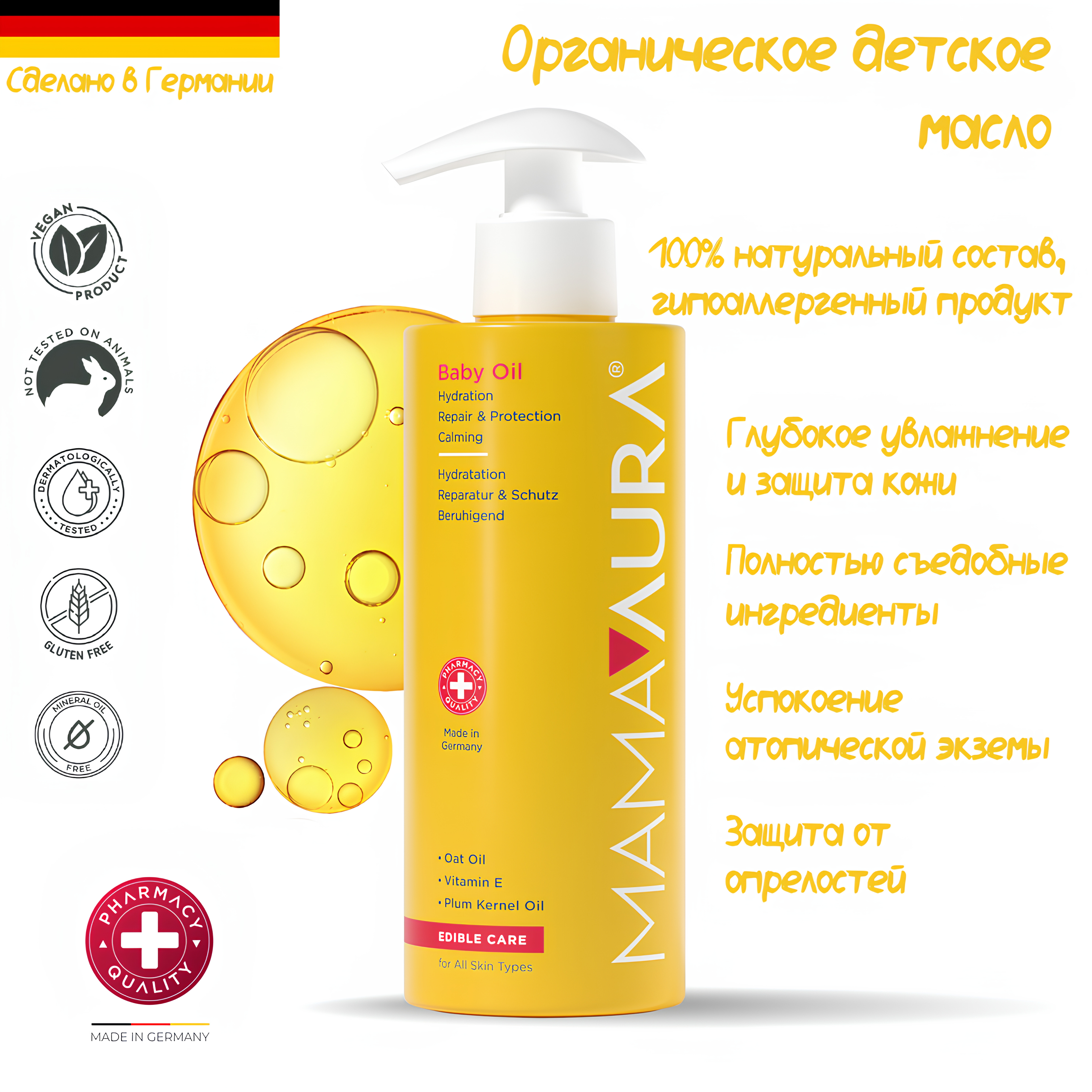 Детское масло Mamaaura Baby создано из 100% съедобных ингредиентов, чтобы обеспечить максимальную безопасность для вашего малыша. Это нежное масло глубоко увлажняет и успокаивает чувствительную кожу малыша, идеально подходя для ухода за кожей головы, зоной под подгузником, увлажнения и массажа. Благодаря органическим маслам подсолнечника и овса, а также витамину e, оно обеспечивает длительное питание и защиту без агрессивных компонентов и раздражающих веществ.