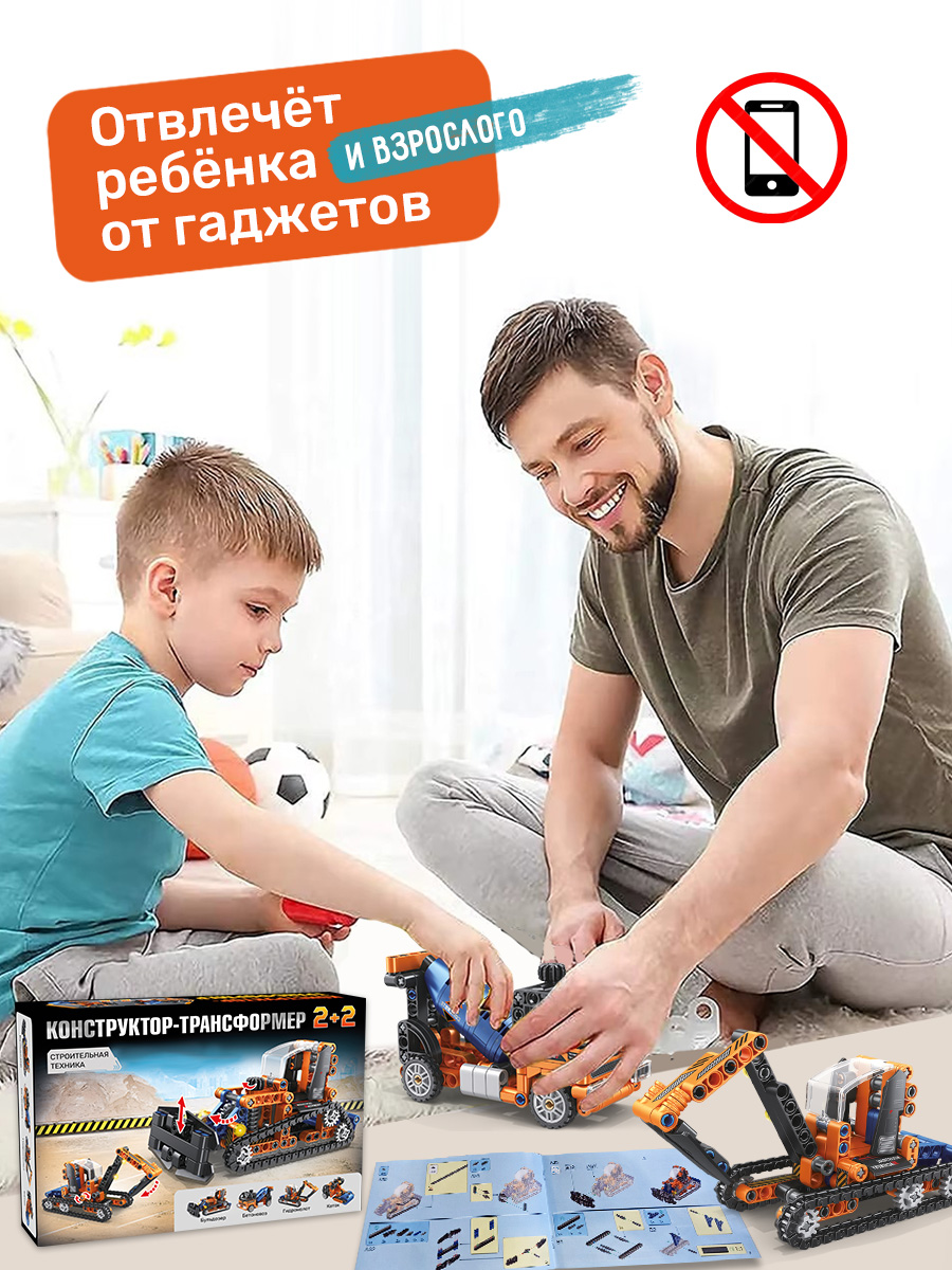 Собрать своими руками объёмные строительные машины?! Стать настоящим строителем у себя дома? Это мечта ребёнка, которую легко воплотить в жизнь! Представляем вам классный конструктор-трансформер «Строительная техника» 4 самые популярные модели строительной техники – бульдозер, бетоновоз, гидромолот, каток – уже готовы пополнить автопарк ребёнка! Конструктор 2 + 2 позволят одновременно собрать 2 модели: бетоновоз или каток, гидромолот или бульдозер. Такой процесс будет эффективно тренировать логику, пространственное мышление, усидчивость, а также прекрасно развивать внимание, мелкую моторику, фантазию. Подробная инструкция с яркими картинками и пошаговыми этапами сборки сделает сам процесс создания шедевра МЕГАкомфортным и поистине захватывающим. Многочисленные детали конструктора, высокая детализация, подвижные блоки готового изделия покорят не только ребёнка, но и взрослого. Детали моделей упакованы в отдельные пакетики для удобства и порядка. Каждая деталь легко соединяется и разбирается, что делает процесс сборки доступным для каждого. Такой крутой конструктор непринуждённо, в формате игры, закладывает азы проектирования и мотивирует на результат. Именно так сегодня выглядит лучший IQ -досуг! Не упустите возможность порадовать своего ребёнка и вручить ему уникальный подарок. Дарите лучшее! Дарите радость!