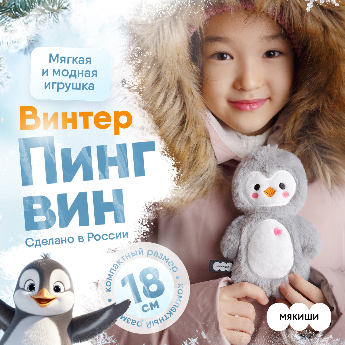 Мягкая игрушка пушистик Пингвин Винтер Мякиши Плюшевый пингвин Винтер (от английского Winter - зима) станет первым верным другом для вашего малыша. Его мягкое и обтекаемое тело с нежным серым мехом приятно держать в руках, а забавный хохолок придаёт игрушке особое очарование. Компактный размер позволяет брать пингвина с собой в детский садик, на прогулку или даже в путешествие. Благодаря своему уютному дизайну, пингвин с радостью будет сопровождать ребёнка в игре и дарить тепло во время сна. Плюшевый пингвин учит заботе и общению, ведь он легко становится участником сюжетно-ролевых игр. Его милое пузико идеально для нежных объятий и лёгких прикосновений, что помогает развивать тактильные ощущения малыша. А благодаря высококачественным и гипоаллергенным материалам игрушка безопасна для детей и сохраняет свой вид даже после многократных стирок. Пингвин Винтер может стать не только любимой игрушкой, но и стильным элементом интерьера детской комнаты. Его милый образ делает игрушку подходящей для подарка на день рождения, Новый год или любой другой праздник. Винтер — это кусочек зимней сказки, который подарит уют и радость детям всех возрастов. Соберите коллекцию всех друзей серии «Пушистики»: Песца, Фенька, Сову, Пингвина, Зайца, Кошечку Саманту и Мишку Шарлотту, чтобы создать целую армию милых пушистых друзей, которые будут радовать девочку или мальчика