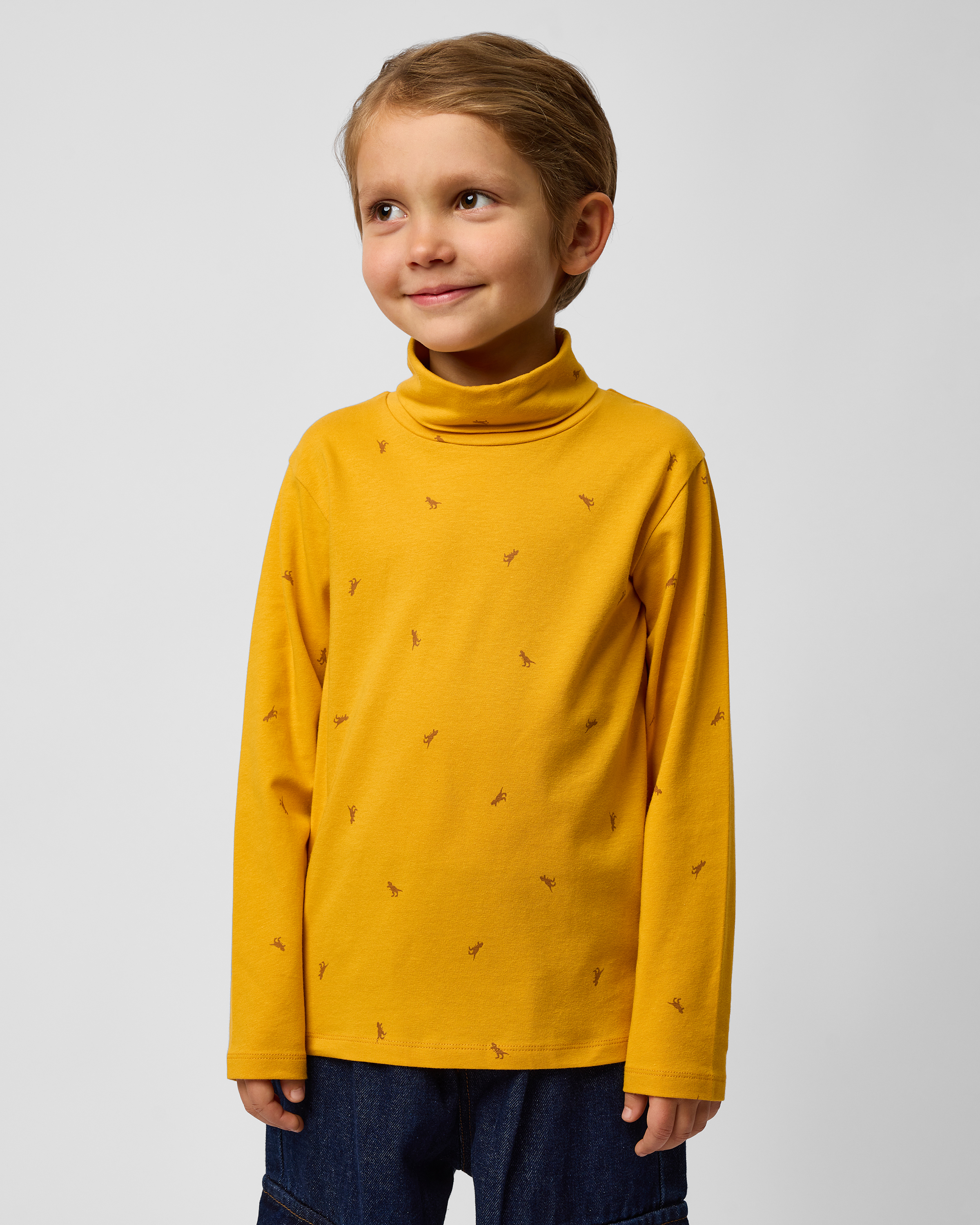 Водолазка для мальчика Futurino горчичного цвета, декорированная принтом с динозаврами.