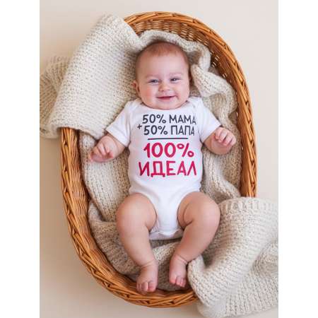 Боди для новорожденных мальчиков и девочек с короткими рукавами выполнен из трикотажного материала - интерлока (100% хлопок). На боди выполнен оригинальный принт для новорожденных. Стильная надпись для малышей "50% мама+50% папа=100% идеал" будет идеальна для первой праздничной фотосессии Вашей крохи. Бодик с прикольной надписью станет приятным подарком новорожденному: на рождение, первый месяц или годик, на день рождения, 23 февраля, 8 марта, новый год. Боди для малышей может использоваться, как первая одежда для грудничков от 56 до 86 роста для дома, для улицы, похода в поликлинику и в гости. Универсальный крой, надежные кнопочки на бодике мягко расстегиваются и крепко зафиксированы, с ними будет легко менять подгузник при необходимости. Трикотажный материал очень эластичный и не стесняет движения ребенка. Базовые однотонные цвета позволяют сочетать бодики с любыми другими вещами. Ярлыки во всех наших изделиях первого слоя вшиваются снаружи, чтобы не приносить дискомфорта ребенку. При правильном уходе стирка до 30 градусов, вещи не скатываются, не линяют и отлично держат форму. Товары для детей Российского бренда BeeKIDzzZ (БиКИДз), созданного мамой троих детей - это премиальное качество по очень приятной цене для самых любимых в мире.