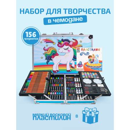 Художественный набор для рисования и творчества в чемоданчике 156 предметов (144 предмета для письма и рисования + восковой пластилин 12 цветов) . Чемодан раскладывается как книга, имеет два выдвижных яруса. Набор - прекрасный подарок ребенку для развития художественных навыков. Набор выполнен из дерева и алюминия, что гарантирует высокую прочность при использовании. Его можно взять с собой в дорогу, детский сад или школу. В набор входят: цветные карандаши – 28 шт, мини-маркеры – 33 шт, акварельные краски – 24 шт, масляная пастель – 24 шт, акварельные краски – 24 шт, палитра – 2 шт, ластик – 2 шт, кисточка – 4 шт, простые карандаши – 2 шт, точилка – 1 шт, восковой пластилин - 12 цветов. Такой набор не только принесет интерес маленьким художникам, но и поспособствует развитию усидчивости, воображения, креативного мышления, аккуратности. Набор станет отличным подарком как для дошкольников, так и для детей постарше.