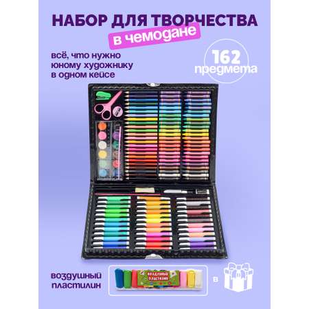 Набор для творчества состоит из 162 предметов, которые помещаются в удобном чемоданчике. В набор входят: фломастеры - 36 шт, восковые карандаши – 24 шт, масляная пастель – 24шт, цветные карандаши – 24 шт, скрепки – 20 шт, акварельные краски – 12 шт, кисточка – 1 шт, палитра – 1 шт, степлер – 1 шт, ножницы – 1 шт, точилка – 1 шт, клей – 2 шт, ластик – 1 шт, линейка – 1 шт, простой карандаш – 1 шт, воздушный пластилин - 12 цветов. Такой набор не только принесет интерес маленьким художникам, но и поспособствует развитию усидчивости, воображения, креативного мышления, аккуратности. Набор станет отличным подарком как для дошкольников, так и для детей постарше.