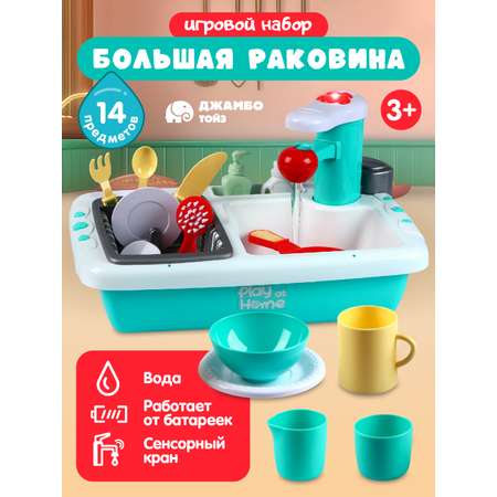 В комплект входят: раковина, кран, 2 бутылочки - имитации моющего средства, 2 плоские тарелочки, глубокая тарелка, ковш, 3 кружки, вилка, ложка, нож, лопатка, щетка для посуды.