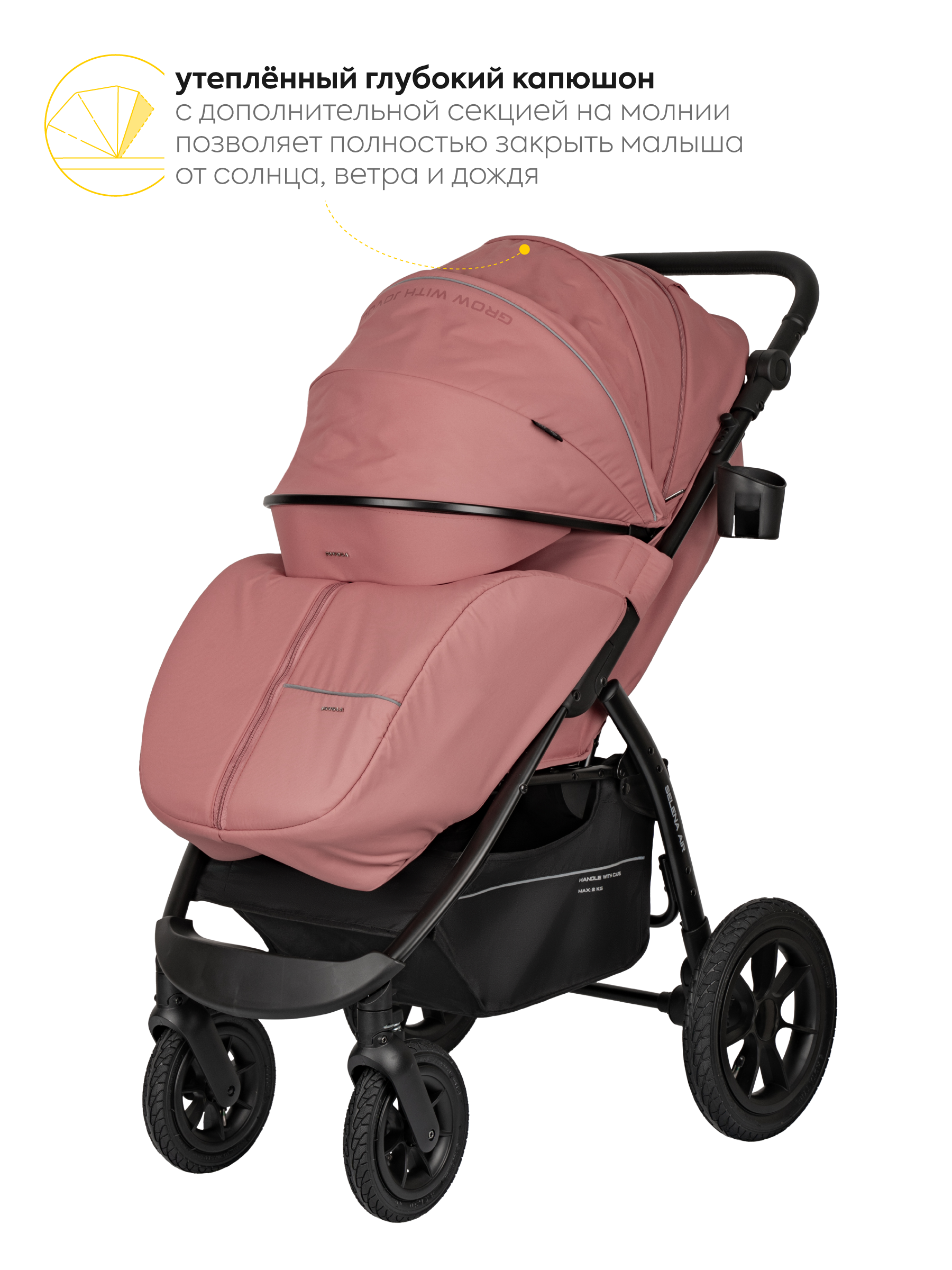 В комплекте все необходимое для комфортных прогулок круглый год: москитная сетка, дождевик, держатель подстаканник для бутылочек, утепленная накидка для ног, насос для подкачивания колес.