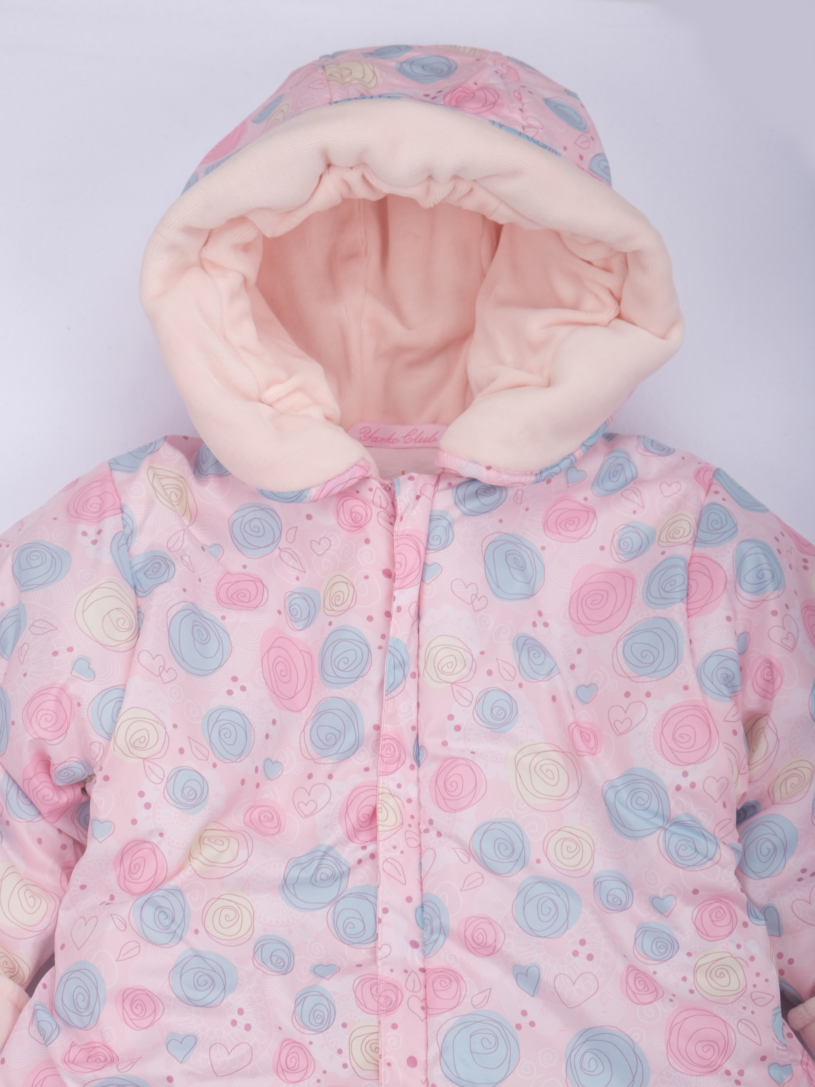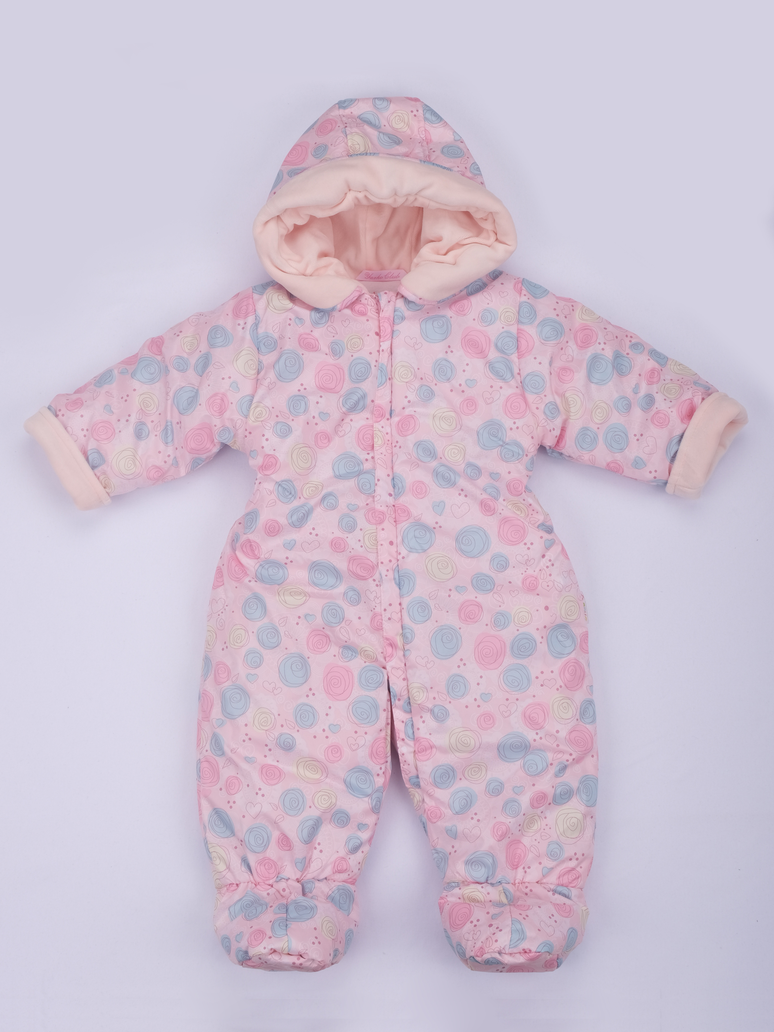 Комбинезон из плащевого материала на кулирной подкладке и на синтепоне 100+100 грамм. Застежка на молнию, молния закрыта ветрозащитной планкой. Комбинезон с большим капюшоном - капором (подкладка капюшона - велюр). Капюшон-капор отлшично прилегает к голове за счет вшитой внутрь резиночки, а отлетные части защищают от ветра. Внутри рукавов - вшиты манжеты из эластичной резинки, чтобы ручки малышки не продувало. Сами рукава отворачиваются по мере роста ребенка. Ножки комбинезона закрыты, форма ножек - сапожок.