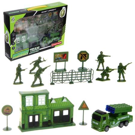 В наборе фигурка КПП, машинка с ракетной установкой, 6 фигурок солдатиков, 4 дорожных знака, изгородь. Всего 13 предметов.
