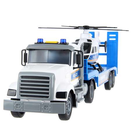 Игрушка на батарейках изготовлена из прочных и долговечных материалов, станет замечательным подарком для детей на Новый год и День рождения, ребенок узнает больше о работе спецтехники. В наборе тягач, платформа и вертолет.