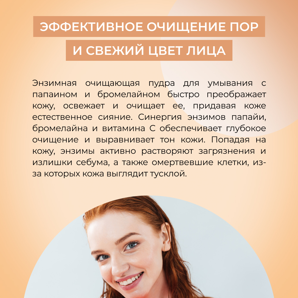 НАТУРАЛЬНАЯ ОЧИЩАЮЩАЯ ЭНЗИМНАЯ ПУДРА ДЛЯ УМЫВАНИЯ Натуральная энзимная пудра для умывания обеспечит глубокое очищение и мягкое отшелушивание кожи, выравнивание тона, сияние и профессиональный уход. Это многофункциональное средство содержит комплекс энзимов, каолин и витамин С, которые помогают от расширенных пор, работают против черных точек, прыщей, акне и пигментных пятен, уменьшают блеск. Женское очищающее средство обладает рассыпчатой консистенцией, при контакте с водой образуется нежная отбеливающая пенка. Флакон имеет объем 160 граммов, такого объема хватает не на один месяц. Кожа более матовая после умывания, становится гладкой и приятной на ощупь. Выравнивающая антибактериальная пудра с эффектом отбеливания подойдет для жирной, сухой, комбинированной, проблемной, а также возрастной и подростковой кожи. Эко состав позволяет глубоко очистить лицо и область шеи от загрязнений и макияжа, при этом не вызывая шелушения, покраснений и воспалений.