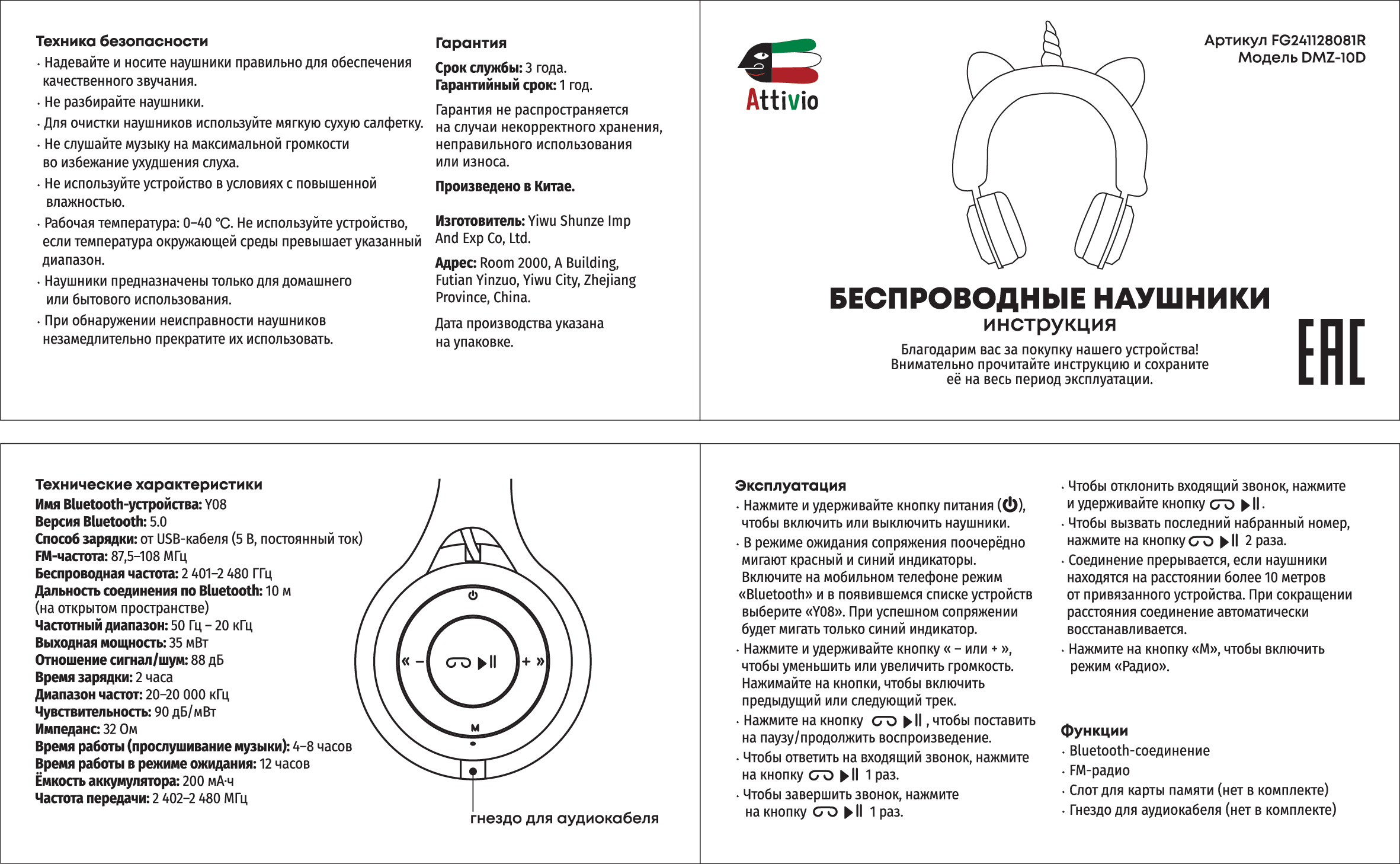 Цена на Наушники Attivio Bluetooth Единорог - 899 ₽.