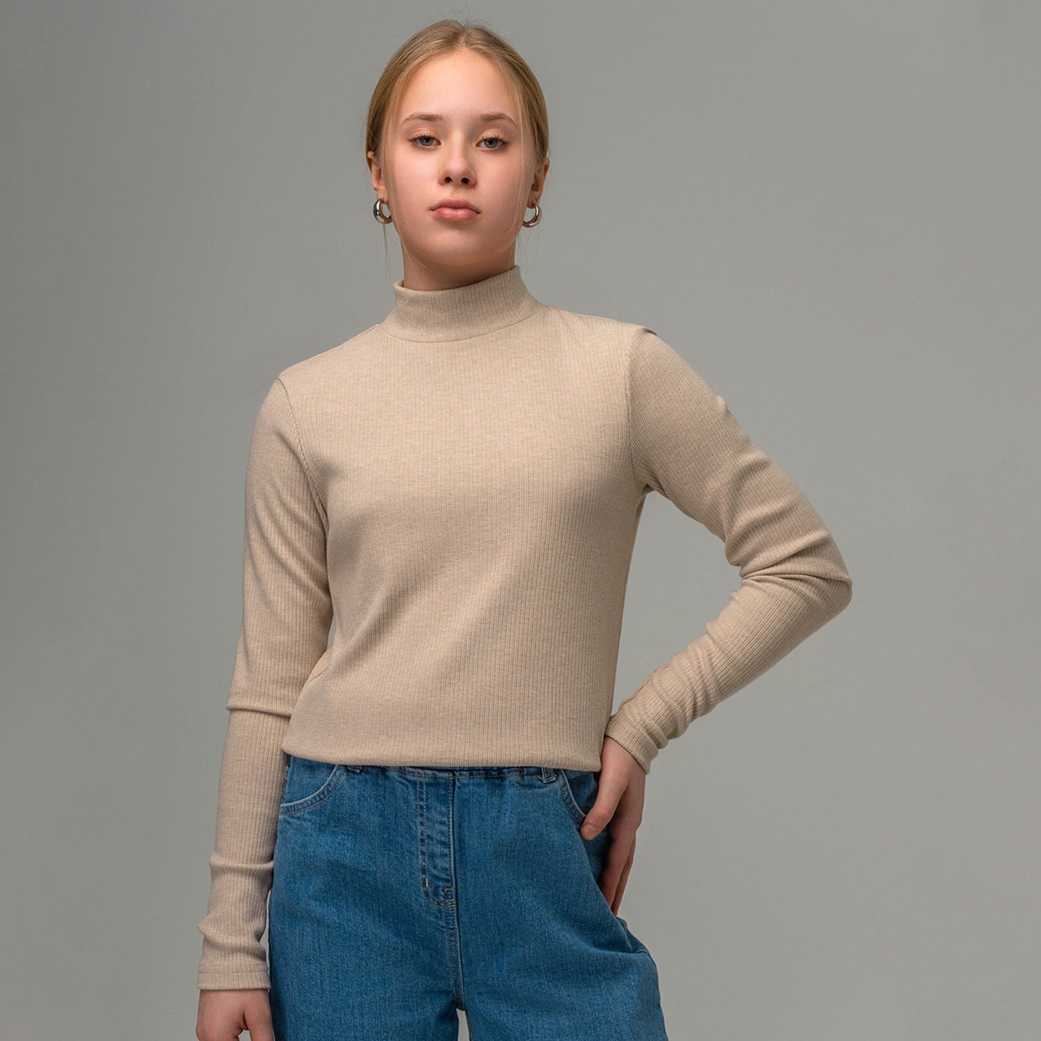 Длинные рукава и воротник-стойка прекрасно защищают в прохладные дни, а рубчик добавляет изящности. Однотонная бежевая водолазка легко сочетается с другими предметами школьного гардероба, что позволяет создавать новые стильные образы.