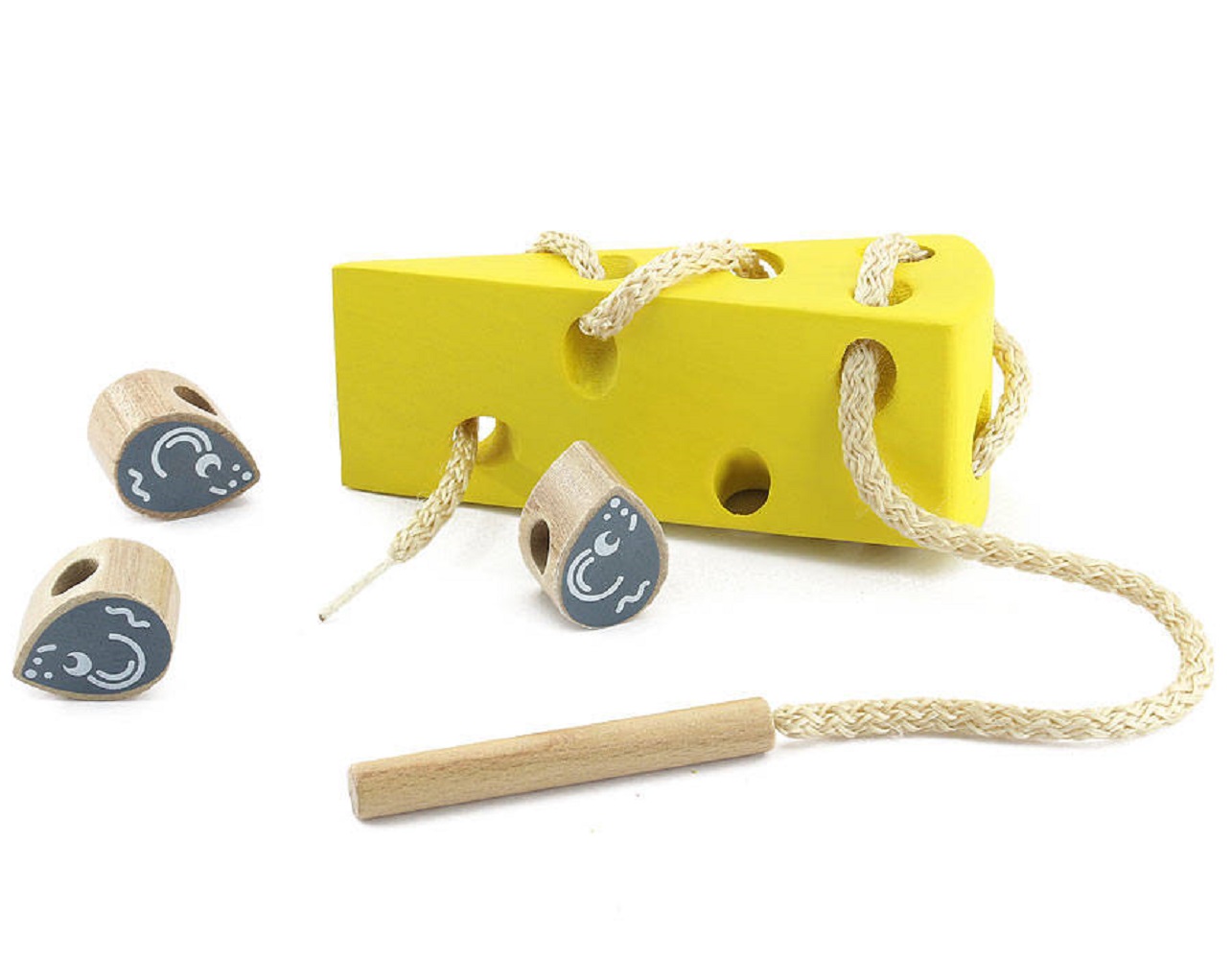 Эта замечательная необычная шнуровка включает в себя деревянный кусок сыра с отверстиями, трёх мышек и шнурок с палочкой. Задача ребенка - продеть шнурок через отверстия, попутно нанизывая не него мышек. Веселое увлекательное занятие как для малыша 1-3 лет, так и для дошкольника постарше. Сыр раскрашен в яркий желтый цвет, при этом краска не токсична - в ее основе обыкновенная вода. Сам сыр выполнен из аккуратно отшлифованного вручную дерева. Занимательная развивающая шнуровка не только приносит веселье, но и тренирует координацию движения малыша, учит сопоставлять причинно-следственные связи и лучше понимать законы передвижения предметов в пространстве.