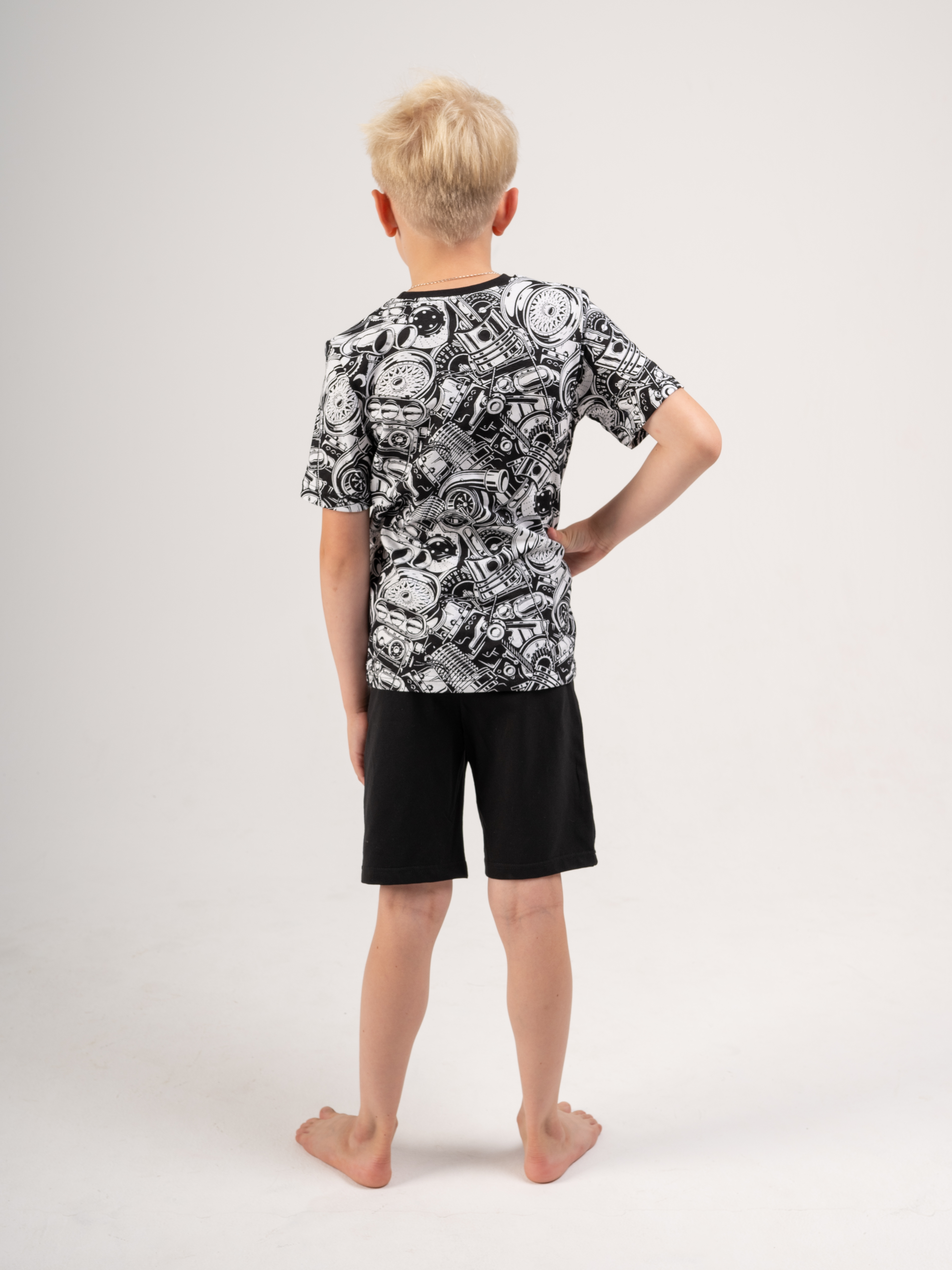 КПредставляем уникальный комплект для активного мальчика! Футболка с яркой 3D-графикой "Инструменты" — настоящий хит среди мальчишек: динамичный и яркий рисунок с эффектом объёмности привлечёт внимание к уникальному стилю вашего ребёнка. Комплект изготовлен из качественного турецкого хлопка, футболка мягко обнимает тело, не сковывая движений, а короткий рукав делает её идеальным выбором для тёплых дней. Шорты — не менее важный элемент этого гардероба. Однотонные чёрные шорты с глубоким боковым карманом выполнены из материала высокого качества с плотной простроченной резинкой, обеспечивающей комфортную посадку. Эти шорты не только практичные, но и стильные, позволяют ребёнку выглядеть уверенно и брутально. Благодаря эластичным свойствам, они идеально подходят для активного дня в детском саду или школе, а также для отдыха дома. Ткань не потеряет яркости и цвета даже после множества чисток. Можно смело сочетать элементы по отдельности или носить их вместе, создавая уникальный брутальный образ, который выделит вашего сына среди сверстников. Идеальное сочетание стиля и комфорта для каждого дня.