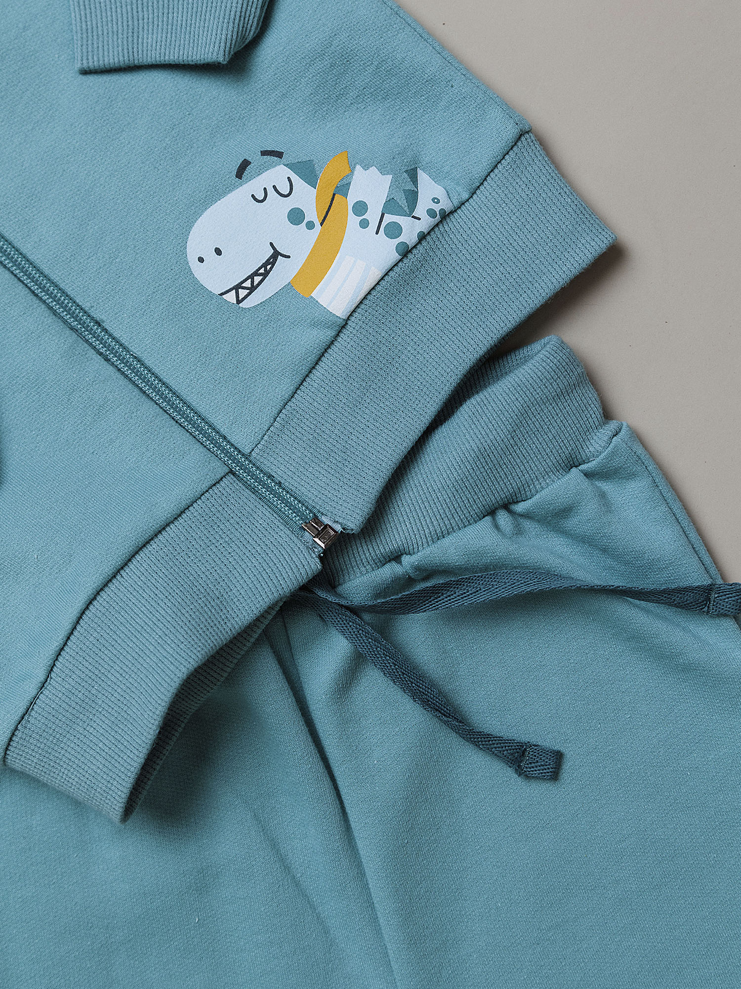 Комплект из футера для мальчика в ментоловой расцветке: толстовка и штанишки. Толстовка с застежкой на молнию и капюшоном. Штанишки на мягкой резинке со шнурком в поясе. Эластичные манжеты рукавов и брючин.