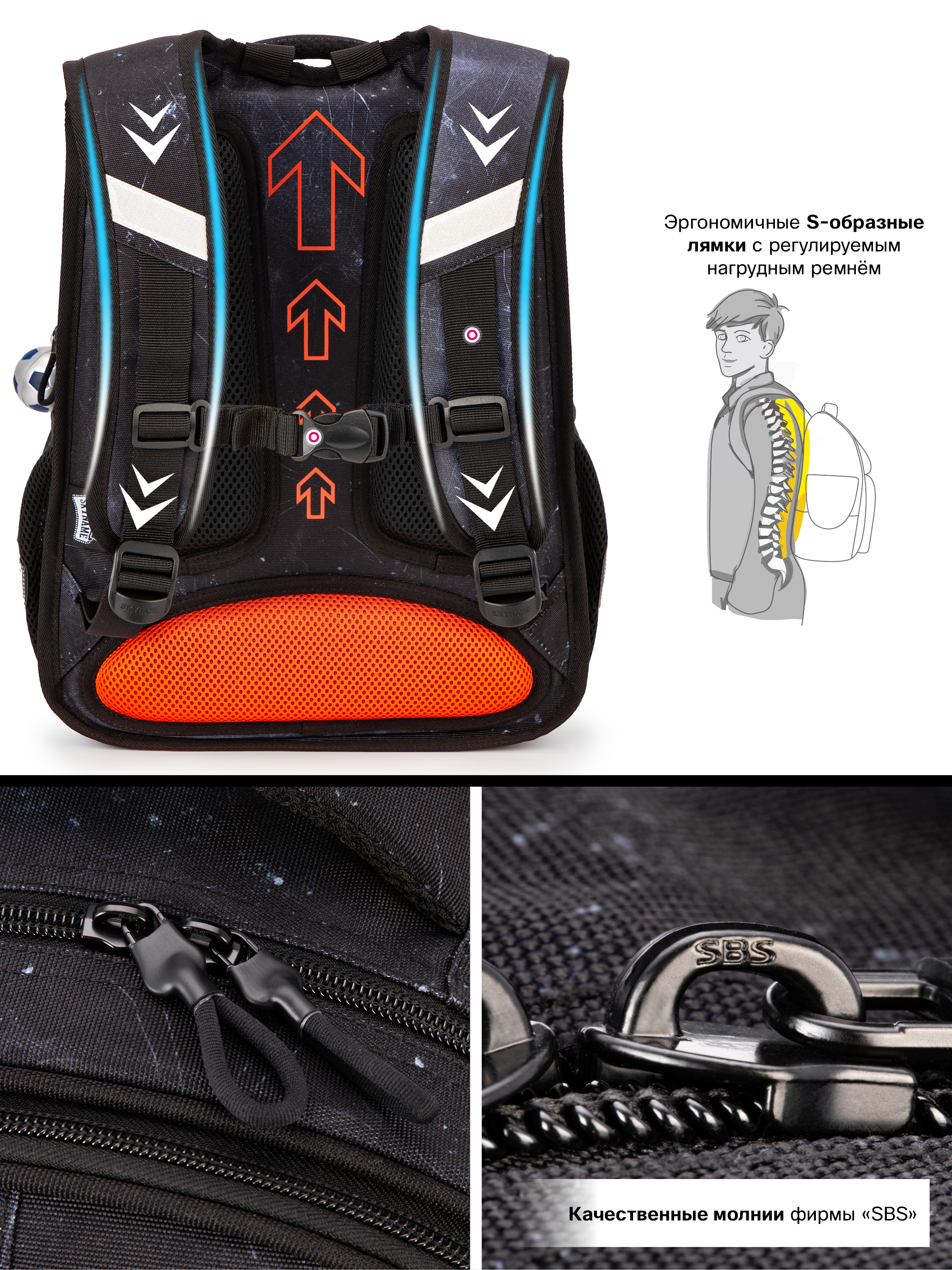 Рюкзак школьный для мальчика объемом 17 л SkyName (СкайНейм) весом 760 г с брелоком мячик в подарок для детей младших классов. Анатомическая спинка портфеля обеспечит поддержку во время ношения. Эргономичная форма поможет избежать давления на позвоночник. Благодаря мягким дышащим элементам ранец для начальной школы будет комфортно носить на протяжении всего дня. При максимальной загрузке не меняет форму. S-образные лямки с регулируемым нагрудным ремнем и застежкой фастекс обеспечивают комфорт. Ремни плотные и дополнены мягкими вставками, а их длину можно регулировать. Портфель выполнен из высококачественного и водоотталкивающего материала- это защищает содержимое от влаги. Рюкзак для школы оснащен жестким дном и пластиковыми ножками, что гарантирует его устойчивость. Молния заднего отделения открывается с двух сторон для удобства доступа.