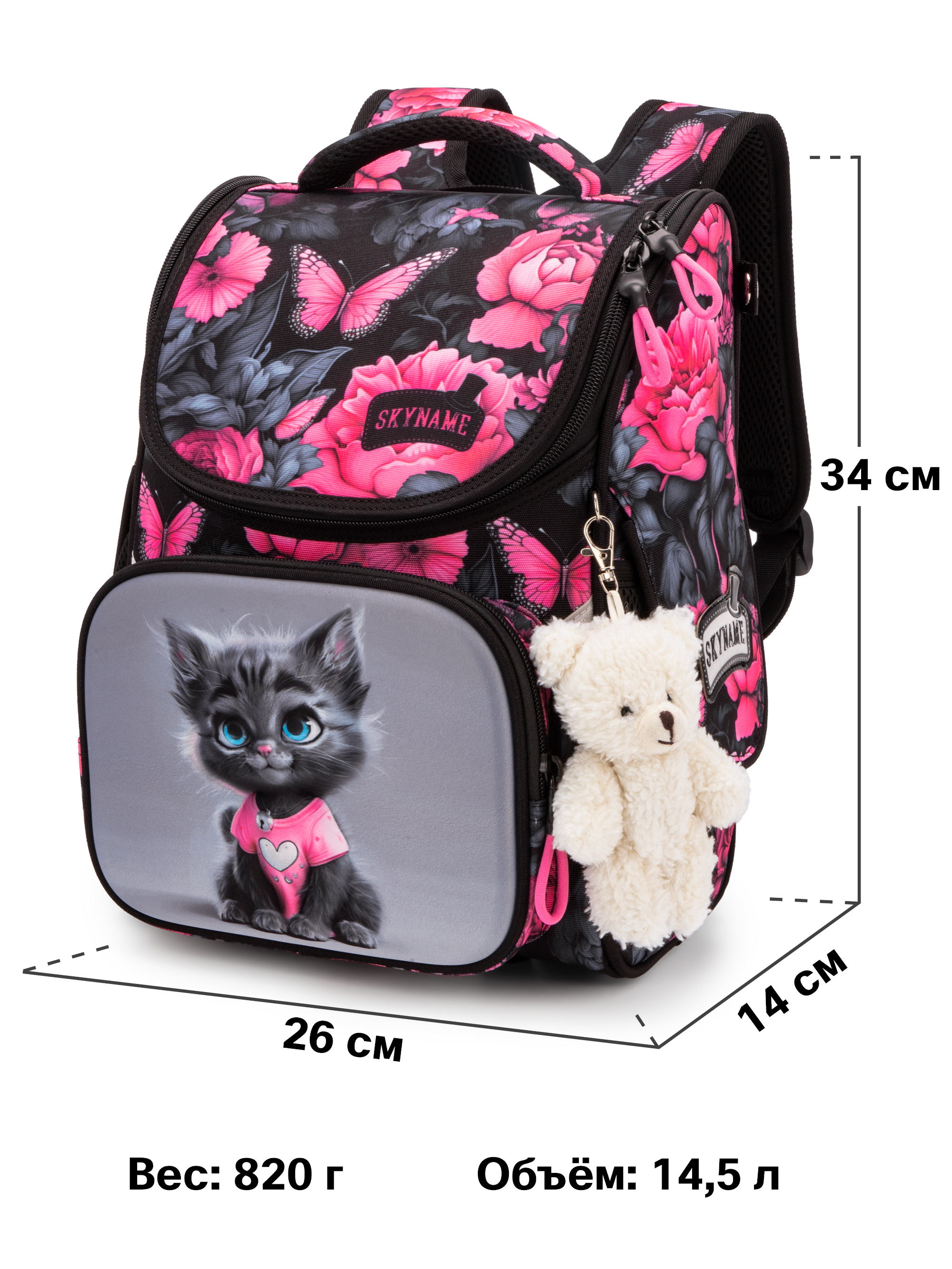 Школьный ранец для девочки SkyName (СкайНейм) с анатомической спинкой 12 л и брелоком мишка в подарок для учеников начальной школы. Спинка эргономичная, учитывающая особенности физиологии детей, и прошита мягкими дышащими вставками. При максимальной загрузке аксессуар для первоклассника не деформируется. Плотные регулируемые S-образные лямки имеют внутренние мягкие подушки. Водоотталкивающая ткань портфеля защищает от влаги в дождливую погоду. Каркасный рюкзак «Раскладушка» можно разложить на 180 градусов, что облегчает доступ к учебникам. В центральном отделении А4 есть два разделителя и резинка для крепления. Еще есть карманы на липучках по бокам и карман-органайзер спереди для хранения мелочей. Качественные молнии SBS с удобными бегунками плавно открываются. Также ранец для младших 1-4 классов снабжен усиленной ручкой сверху с комфортным захватом для переноски и петлей для подвешивания. Для безопасности ребенка есть светоотражающие элементы на видных местах школьной сумки.