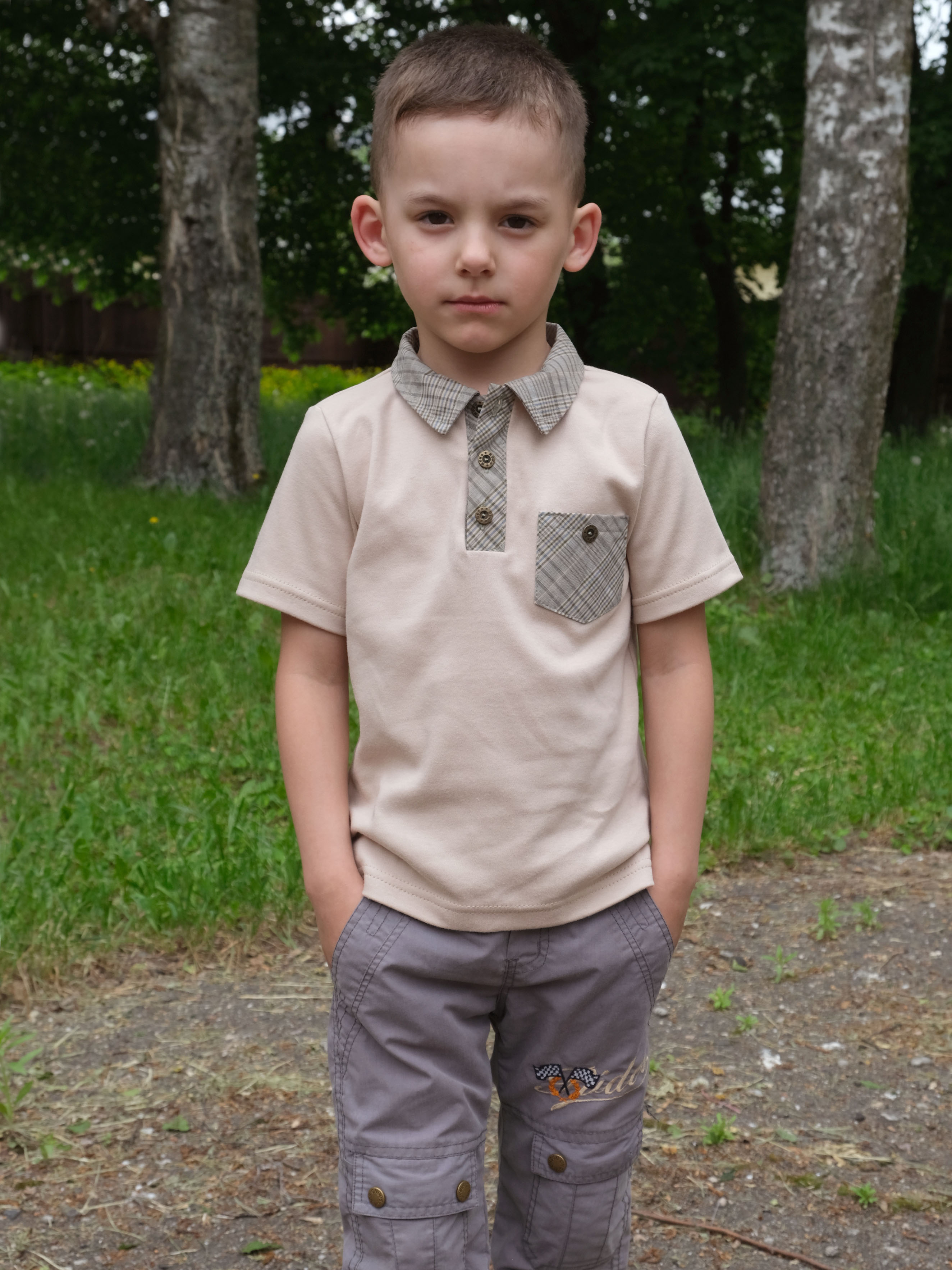 Рубашка-поло из трикотажного полотна - интерлок (100% х/б). Рукава изделия короткие, горловина обработана отложным воротником - поло. Застежка - петли и пуговицы. Воротник выполнен из ткани в клетку, которая отлично сочетается с основным цветом полотна. Так же для украшения на полочке выполнен карман в клетку. Практичная и удобная вещь для мальчиков. Нарядная, строгая, интересная модель для любого повода.