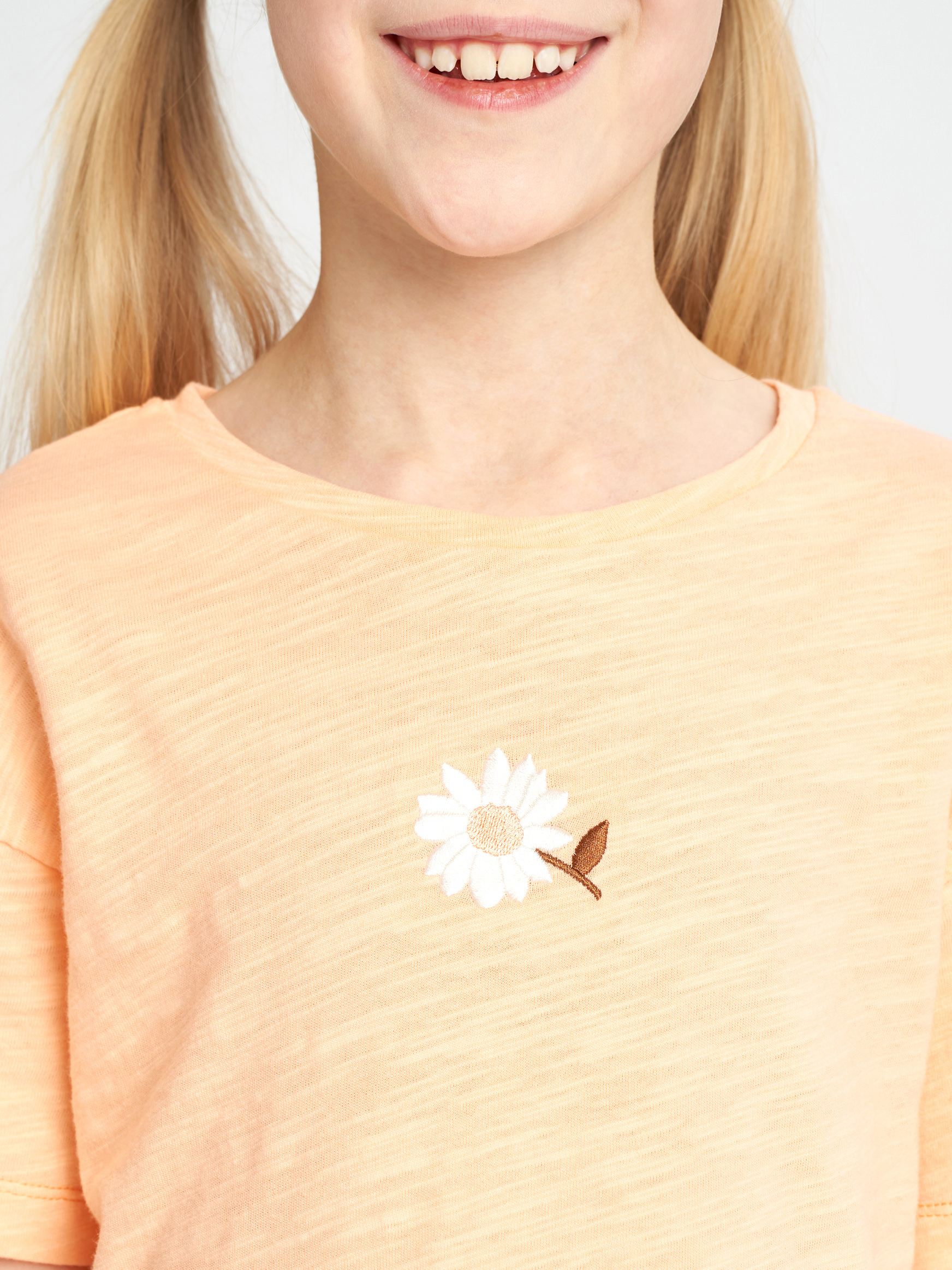 Трикотажная футболка для девочки сделана из хлопковой кулирки, поэтому она мягкая, дышащая, приятная к телу и легкая. Плотность средняя - слегка просвечивается, свободная посадка без прилегания. Детская футболка выполнена с короткими рукавами оптимальной длины и классическим круглым эластичным вырезом. Модель персикового цвета в оттенке манго-шейк добавит нотку нежности любому образу благодаря оборке по нижнему краю изделия. Еще интереснее футболку для девочки делает принт-вышивка с цветком.