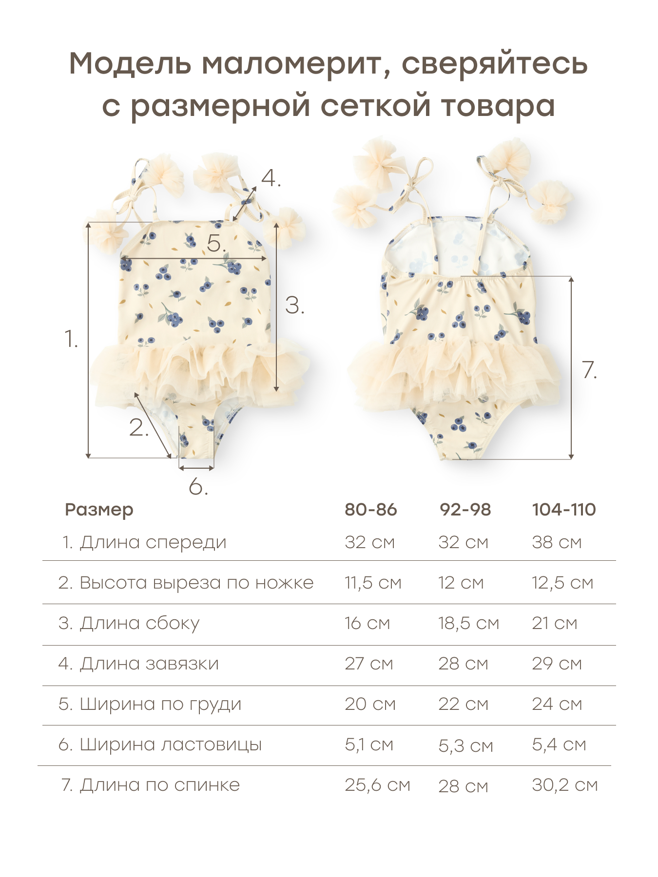 - Взяли на рост 92 см размер 104-110, сел отлично, ребенку было удобно. Приятный материал, очень красивый купальник, постоянно получали комплименты. В подарок положили браслет