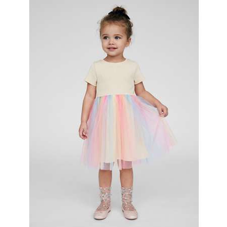 Платье праздничное для девочки с короткими рукавами. Платье отрезное по линии талии. Фатиновая радужная юбка придает платью праздничный вид. Платье подходит для праздника и утренника. Радужная юбка понравится вашему ребенку.