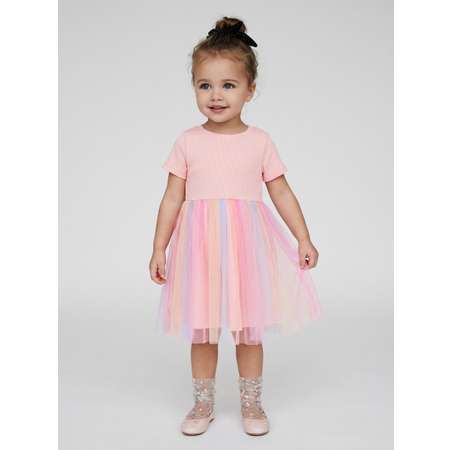 Платье праздничное для девочки с короткими рукавами. Платье отрезное по линии талии. Фатиновая радужная юбка придает платью праздничный вид. Платье подходит для праздника и утренника. Радужная юбка понравится вашему ребенку.