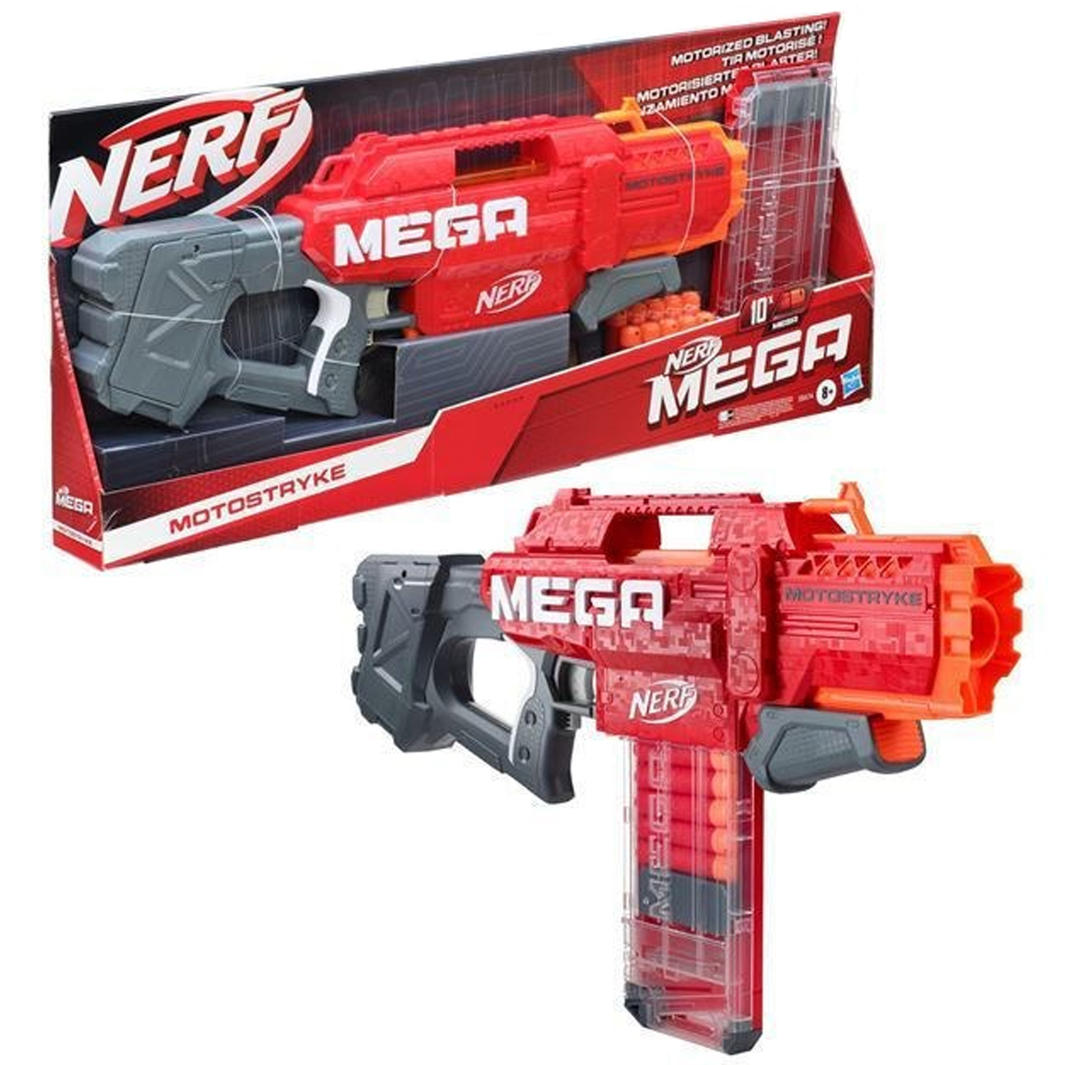 - Огромный, мощный и быстрый моторизованный бластер Nerf Mega Motostryke с обоймой, рассчитанной на 10 стрел, взрывает поле битвы.