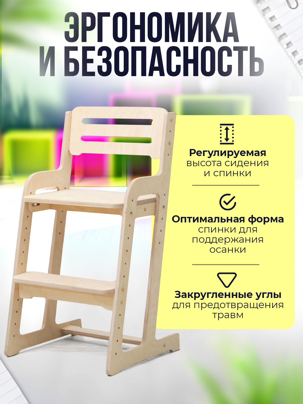 Представляем вам уникальный ростовой стул для детей, который подходит для использования от 2 до 10 лет. Этот стул изготовлен из качественной березовой фанеры толщиной 15 мм. Его элегантный и функциональный дизайн прекрасно впишется в любой интерьер, будь то детская комната или кухня.